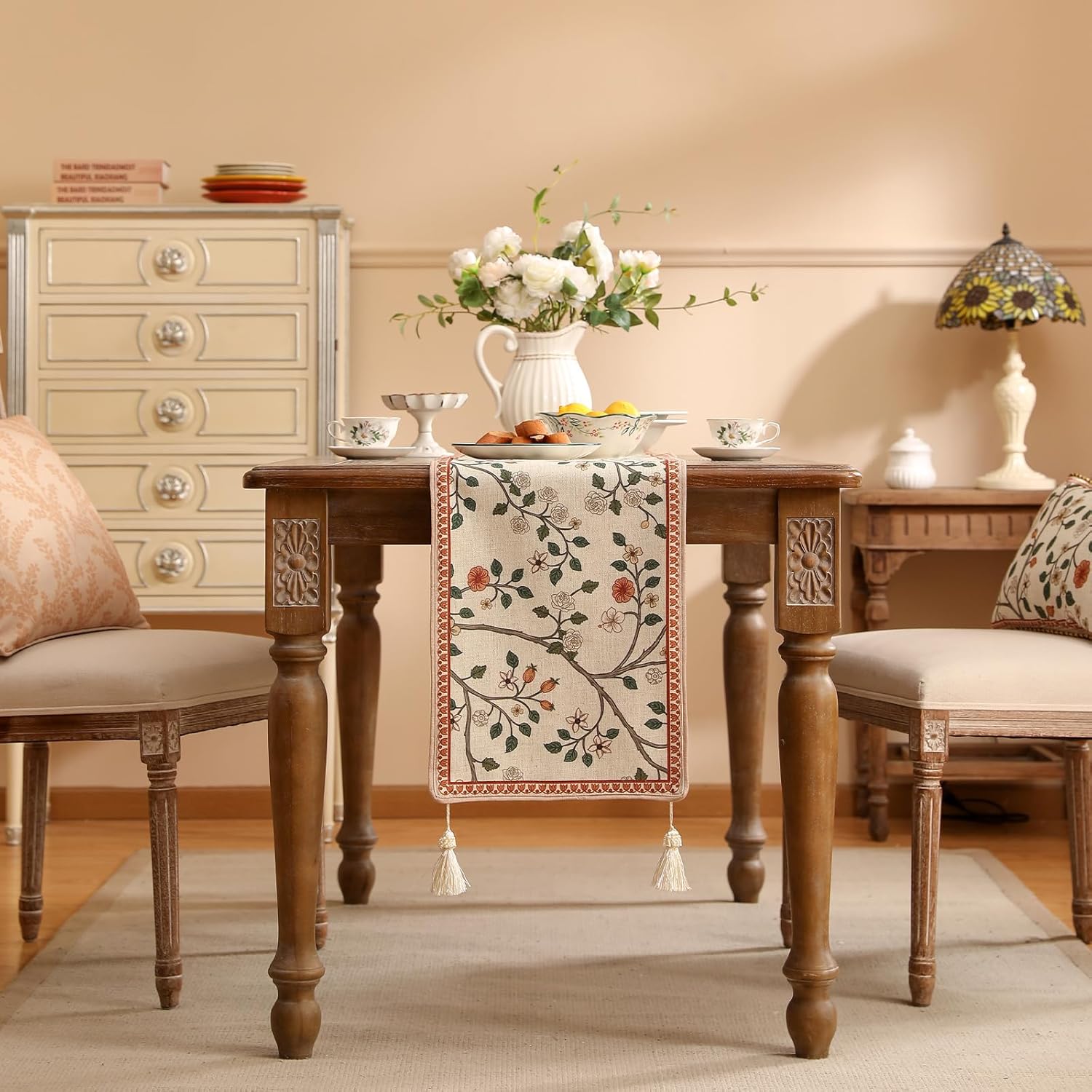 ISAENNE Designer Elegant Linen Floral Table Runner 102 Inches Long,Farmhouse Light Beige Durable Decor Table Runners for Dining Tables,Thanksgiving,Kitchen Tables,Christmas,12"*102"-Flora A