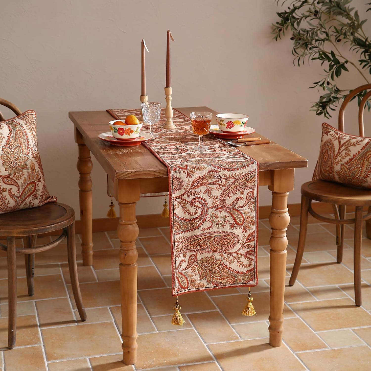 ISAENNE Designer Elegant Red Linen Table Runner 102 Inches Long,Vintage Paisley Pattern Durable Table Runners for Dining Tables,Thanksgiving,Kitchen Tables,Christmas,12"*102"-Chauffrey A