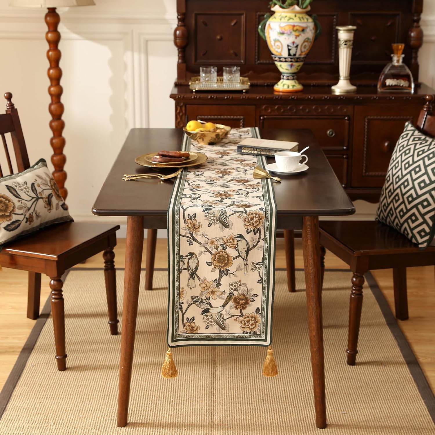 ISAENNE Designer Vintage Beige Linen Table Runner 71 Inches Long,Elegant Floral and Bird Pattern Decor Table Runners for Dining Tables,Thanksgiving,Christmas,Banquet,Party,12"*71"-Murad A