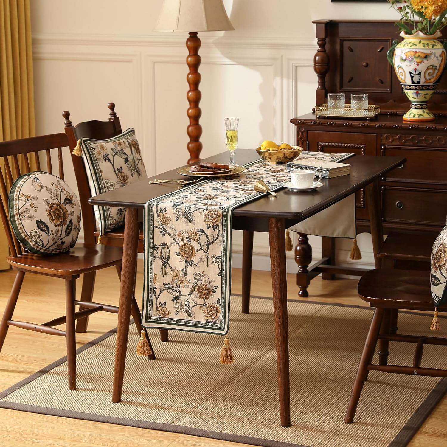ISAENNE Designer Vintage Beige Linen Table Runner 118 Inches Extra Long,Elegant Floral and Bird Pattern Decor Table Runners for Dining Tables,Thanksgiving,Christmas,Banquet,Party,12"*118"-Murad A