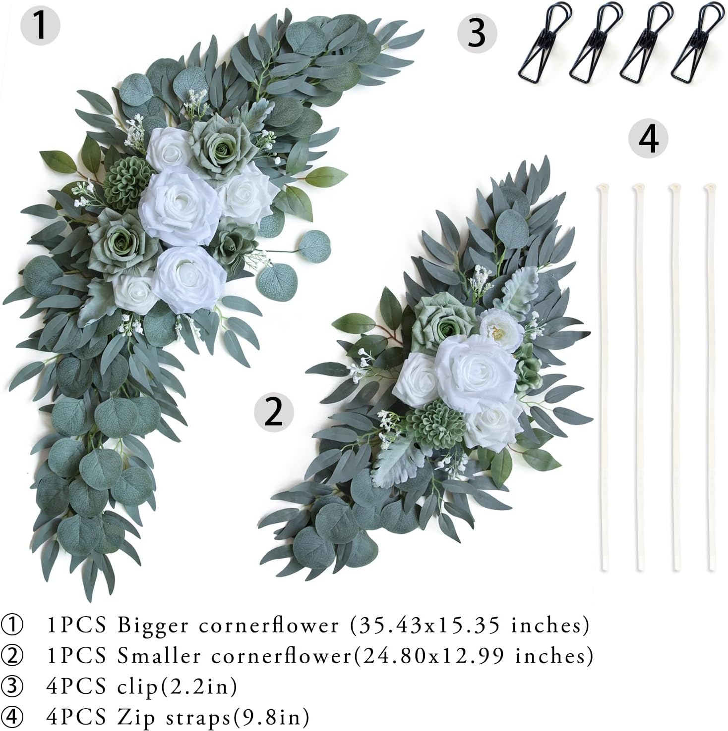 - Package Including: Sage Green Wedding Flowers Ornament x2 + Cable Tie x4 + Metal Clip x4, (Bigger corner flower 32.5X 14.8'', Smaller corner flower 20 X 10.8'', Clips 2.2'', Zip Straps 11.8 '')