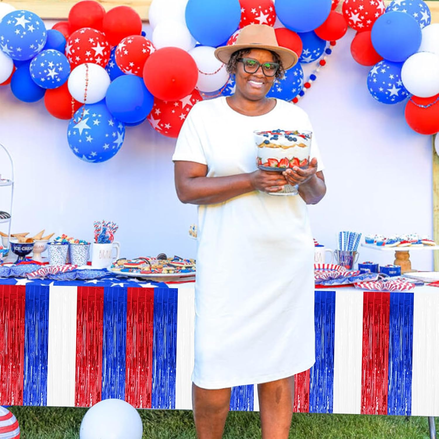 BEISHIDA 2 Pack Metallic Tinsel Foil Fringe Table Skirts for Rectangle & Round Tables Red, Blue, White Kids' Birthday, Holiday Cartoon Party Decorations Birthday, July 4th, Baby Shower, Festive Events
