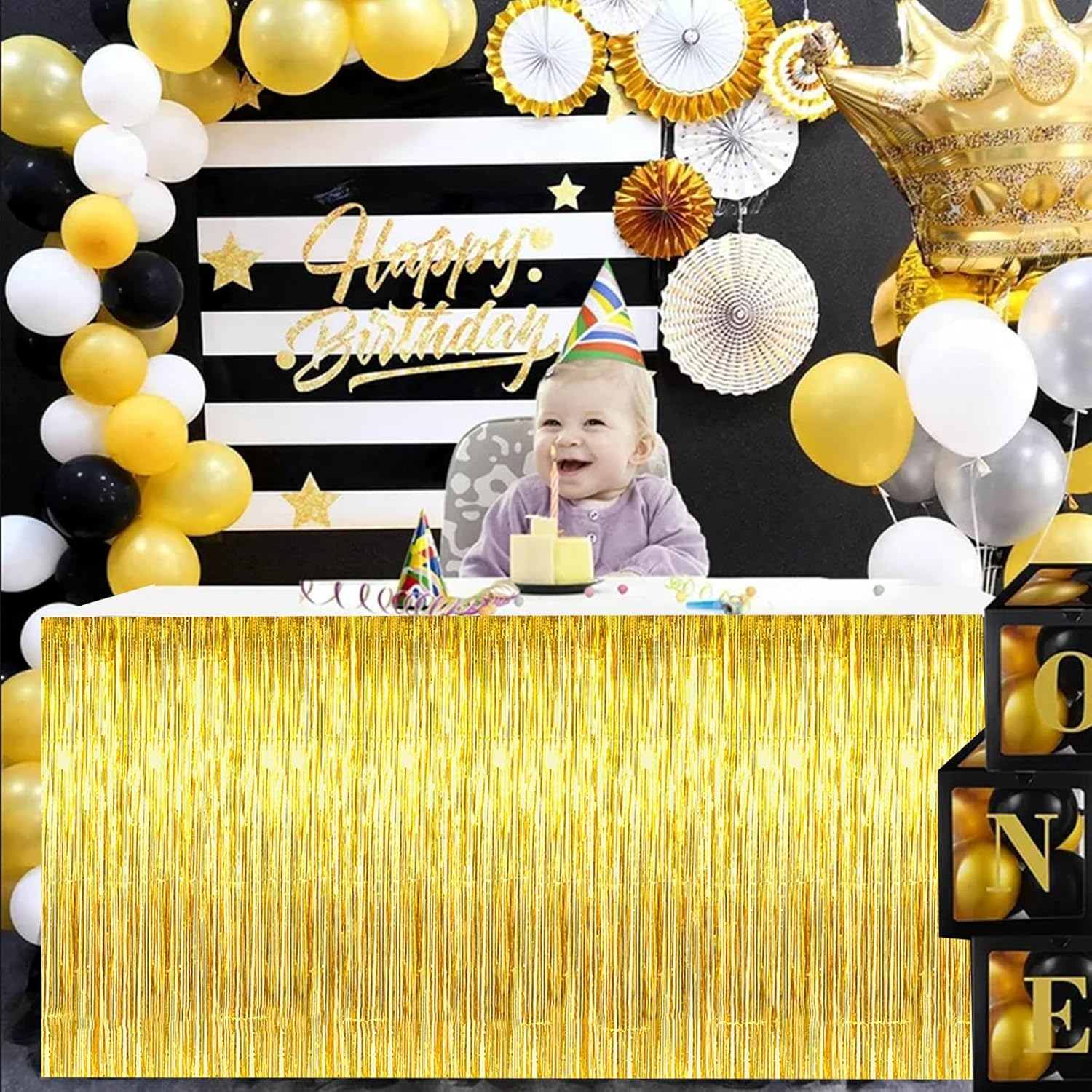 BEISHIDA 2 Pack Gold Metallic Tinsel Foil Fringe Table Skirts - Decors for Rectangle & Round Tables - Birthday & Holiday Party