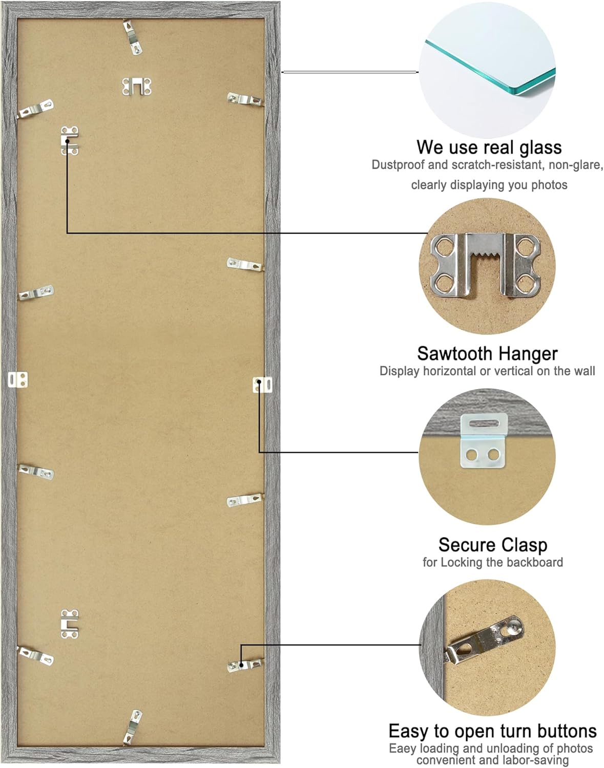 - Easy to Hang - Sawtooth hangers on the back of the frame and wall hook provided allow for quick and easy mounting in portrait or landscape display. Back loader clips keep your images in place- just swivel side to side when you wish to take your print out