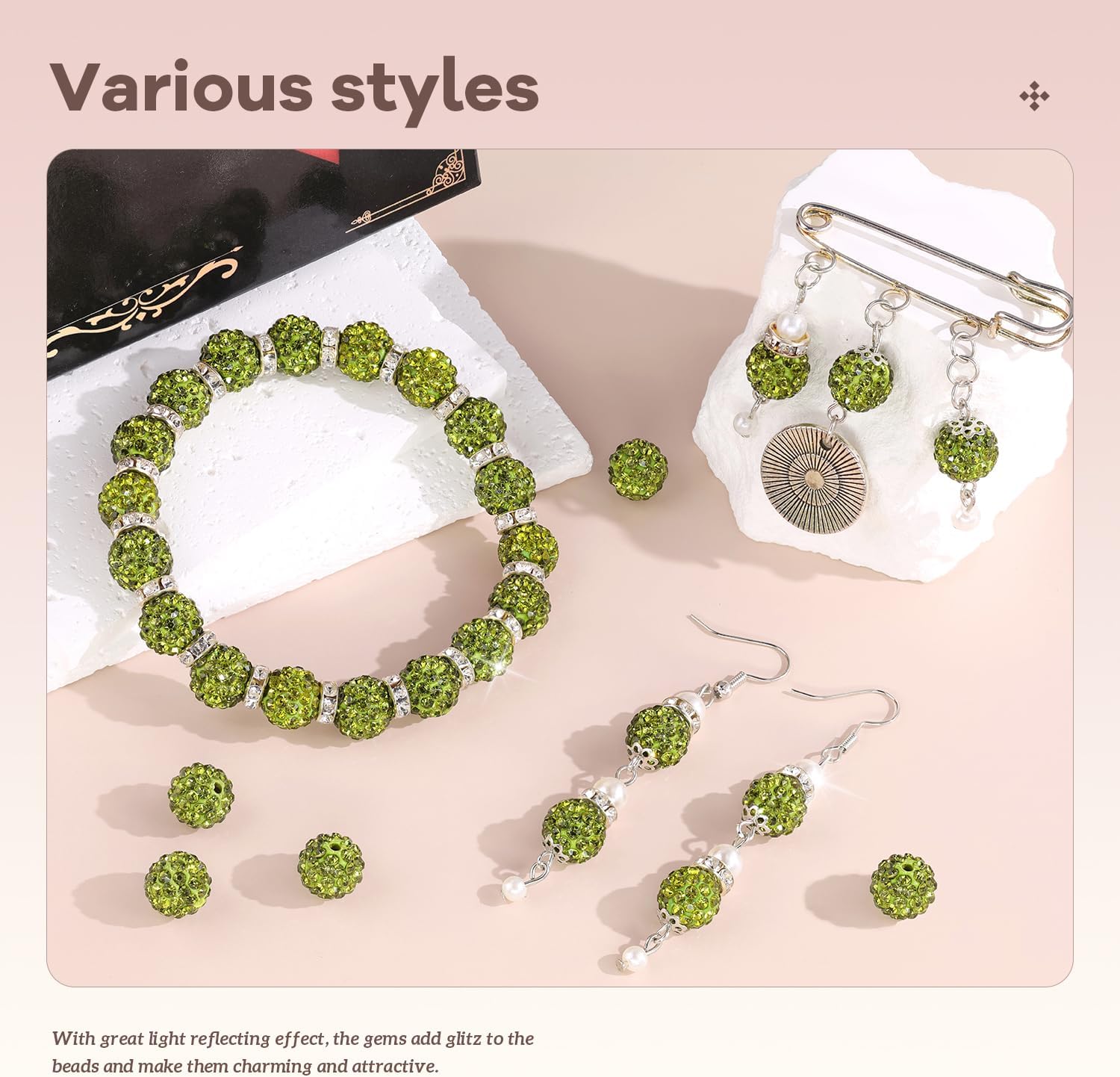 160pcs 10mm Rhinestone Beads for Jewelry Making, Olivine Shiny Round Disco Ball Beads Bulk, Sparkle Crystal Clay Christmas for Bracelet Baseball Necklace Earring Crafting and DIY