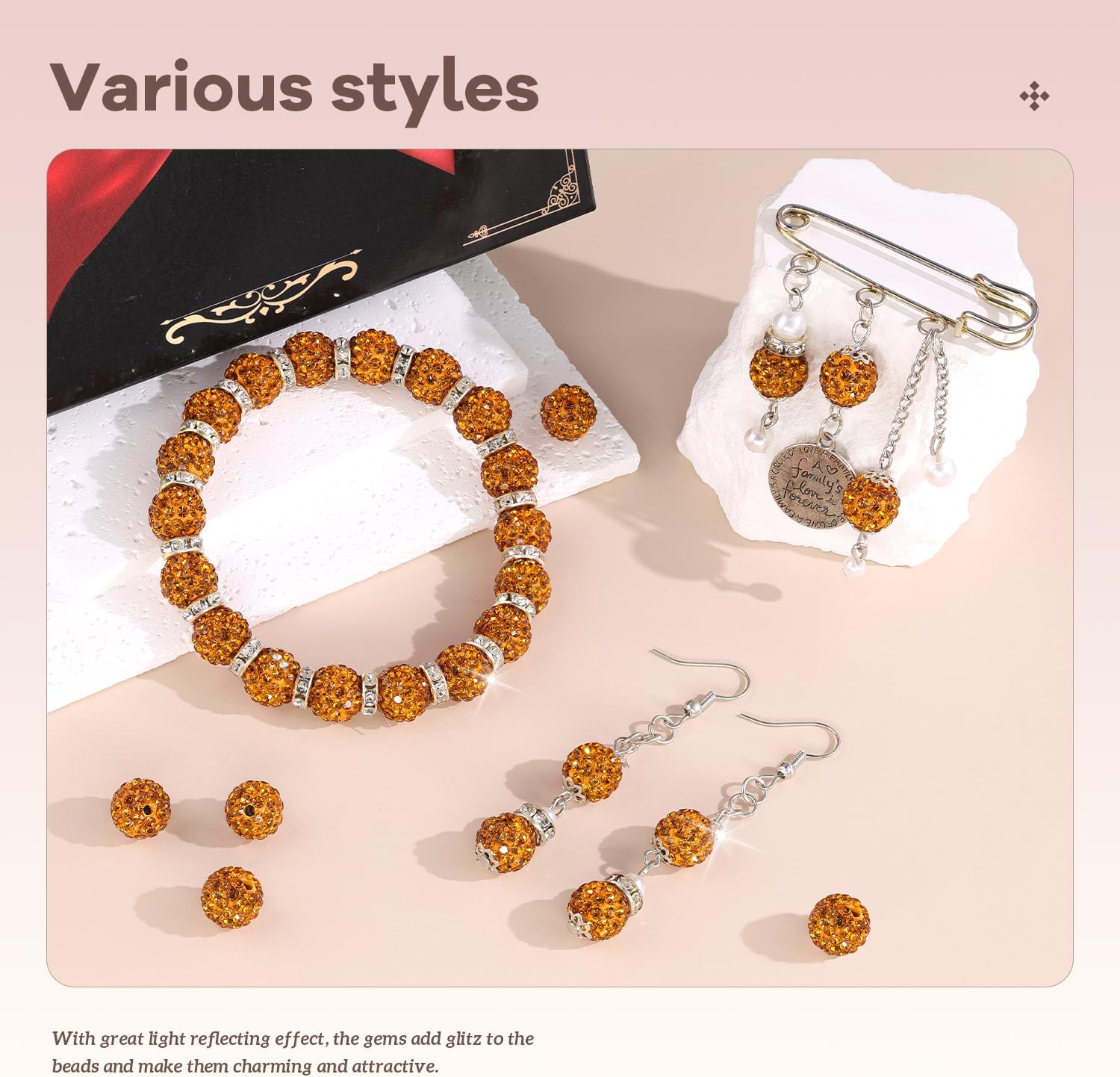 - BLING EFFECT -- Our rhinestone beads are made of polymer clay, embedded with superior quality glass rhinestones. We do quality control management to ensure the high quality of the bling beads. Rhinestones cover the entire surface and are not easy to fall off, shining like a diamond. With great light reflecting effect, the gems add glitz to the beads and make them charming and eye-catching. Wearing ornaments made from these beads, you will be the center of attention.