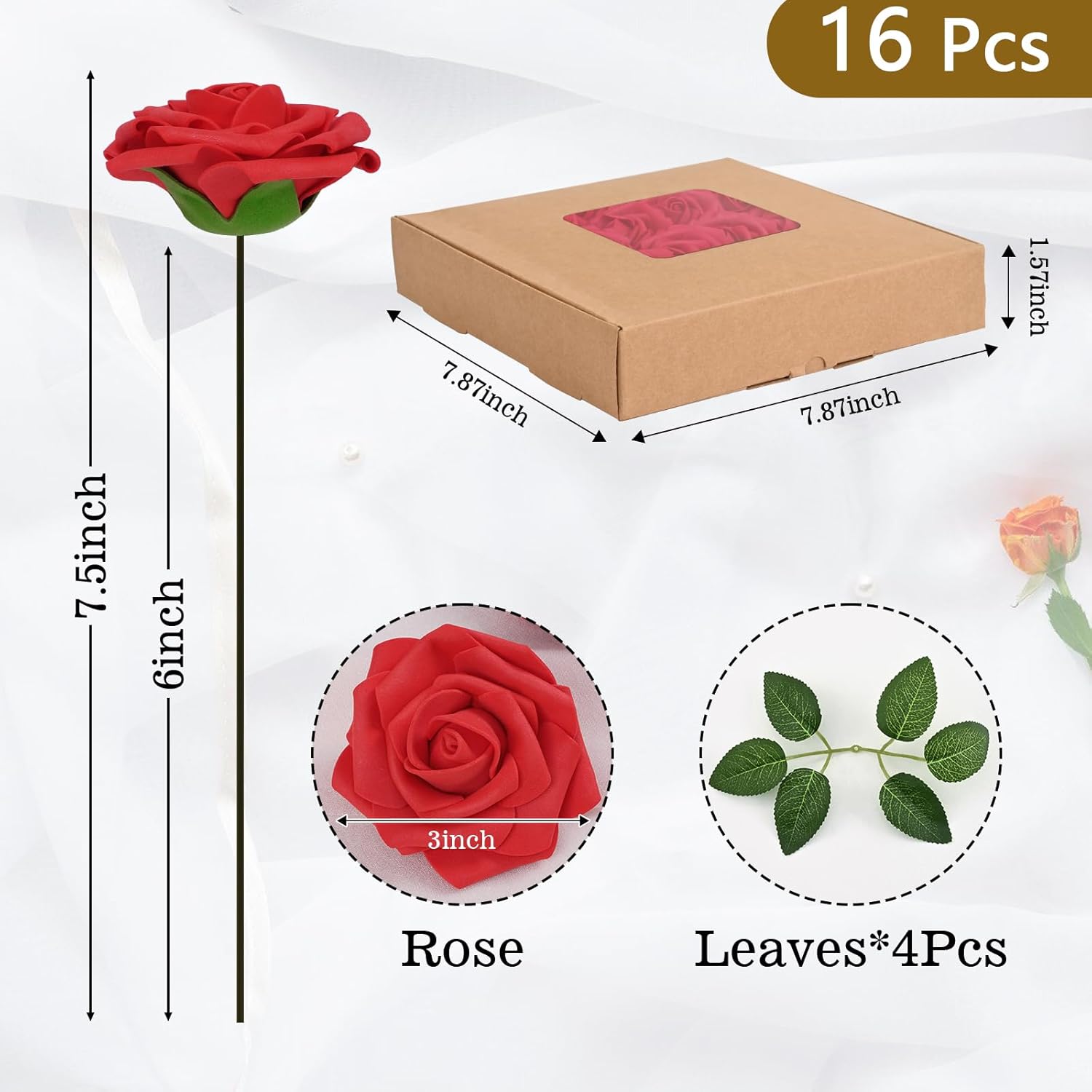 - Kindle Your Creative Flames: The box includes 16 red roses (3" flower head, 8" stem) and 4 green rose leaves, perfect for an array of DIY crafts. Whether creating wedding bouquets, graduation or birthday party ornaments, baby shower decorations, or cake adornments, our faux roses add a touch of class to every important moment.