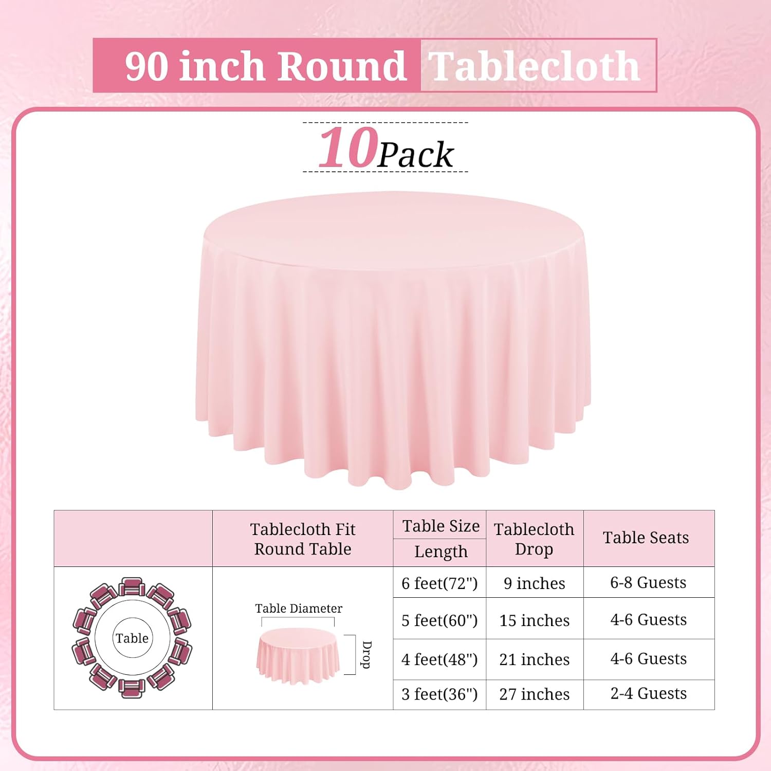 - 【Superior Tablecloth Material】: You will get 10 pack pink round tablecloth, this durable and easy to clean tablecloth is made from premium polyester fabric that resists wrinkling for an always crisp, polished look. Providing more convenience for your using and cleaning. Durable for repeat use.