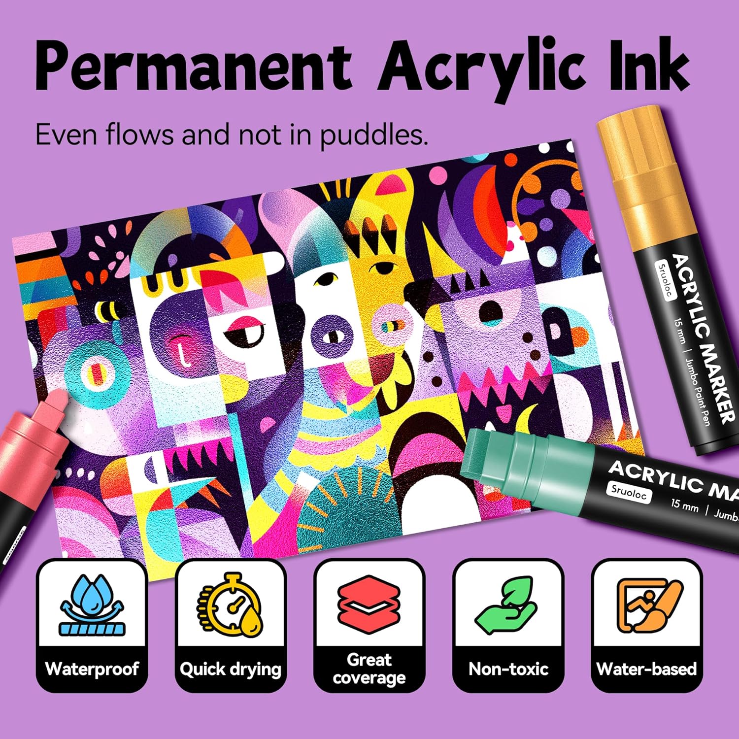 - Jumbo Markers Set: SRUOLOC jumbo markers are made with the highest quality water-based acrylic ink. That is waterproof, quick-drying, permanent , and smooth flow