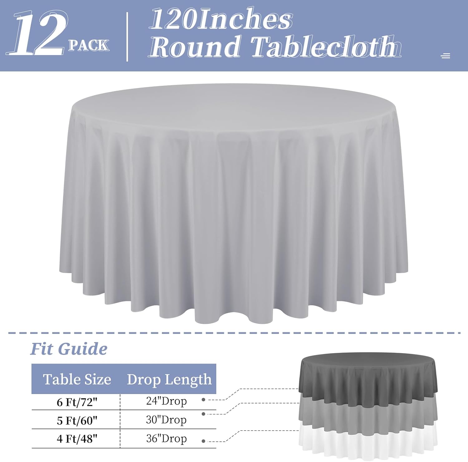 12 Pack Round Tablecloth 120 Inch - Light Grey Polyester Table Cloth for Round Table, Premium Light Grey Tableclothes Washable Fabric Cover for Wedding Party Banquet Restaurant Reception Dining