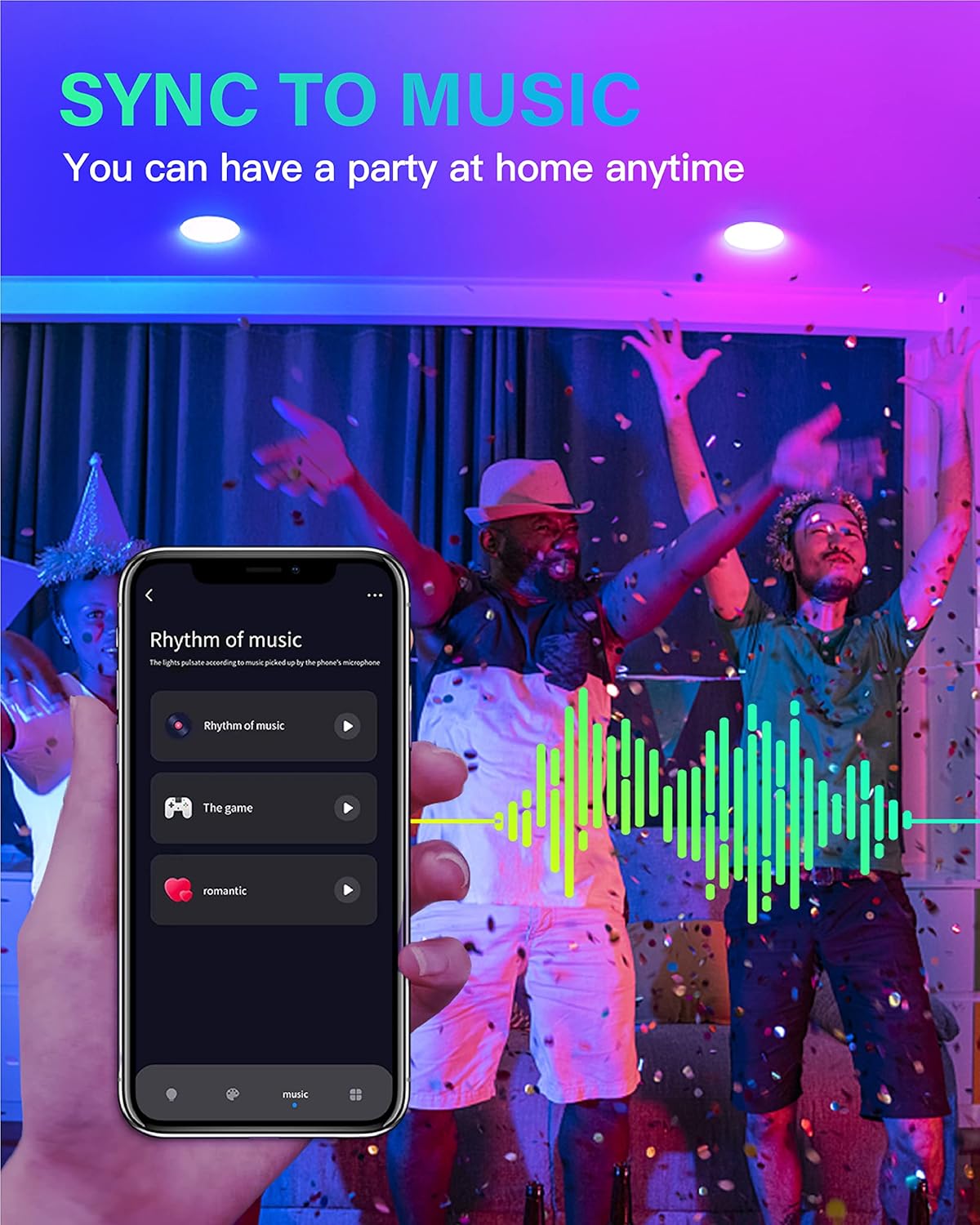 - 【Remote Control】 Our smart recessed lighting 6 inch come with remote controls, which have functions such as group control, color temperature, brightness, mode, etc., so you can control these lights at home or without WiFi.