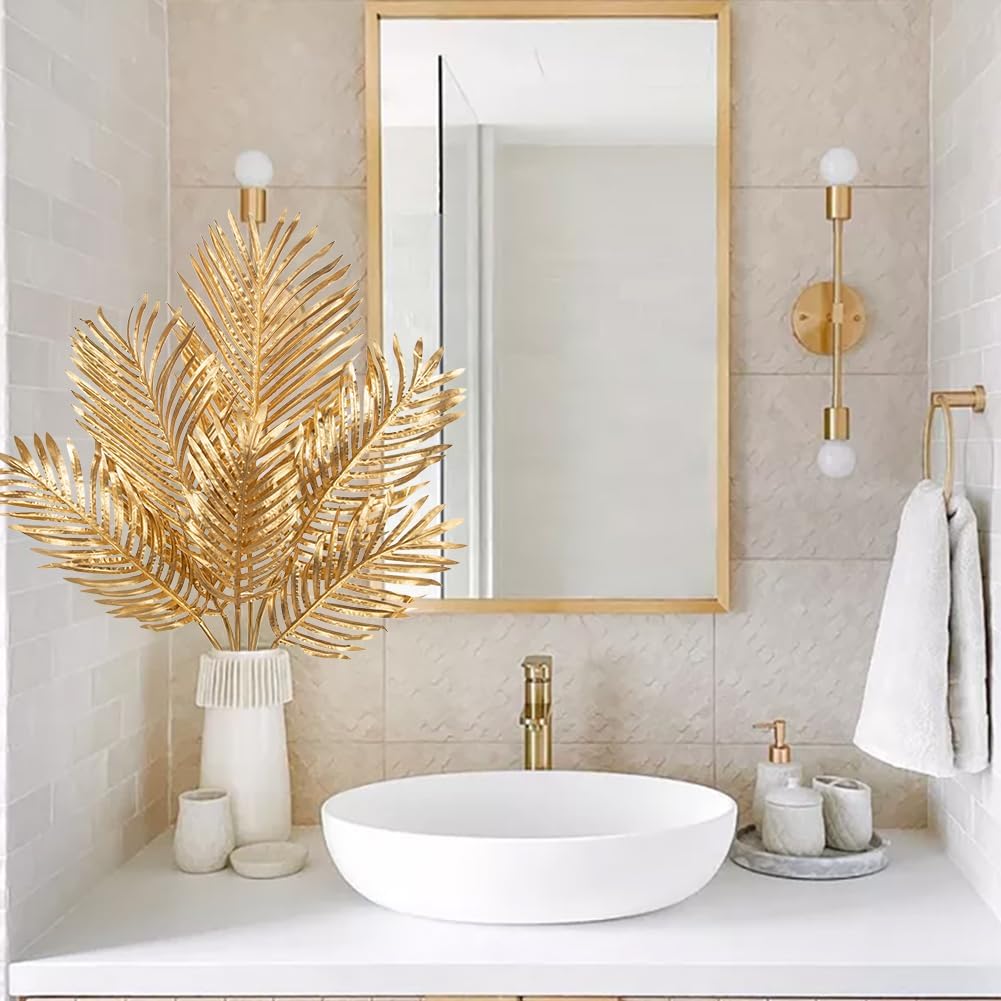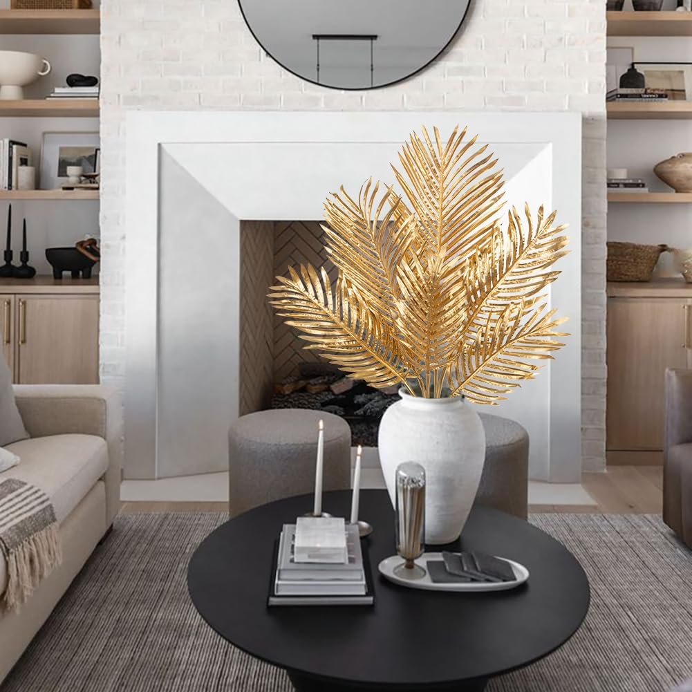 - Please Note: These artificial golden palm leaves are crafted with a Gold finish, which may result in some glitter shedding during handling or unpacking. This is a normal characteristic of the product and does not affect its overall appearance or use. We recommend gently shaking off any loose glitter before arranging.