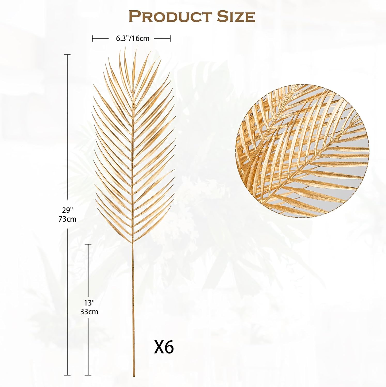 - Package- Set of 6 pcs.Total Length 29", leaf Part 16"×6.3". Note: please note the size before order and please adjust the shape after you got these artificial palm leaf then it will be in good shape as the pictures.