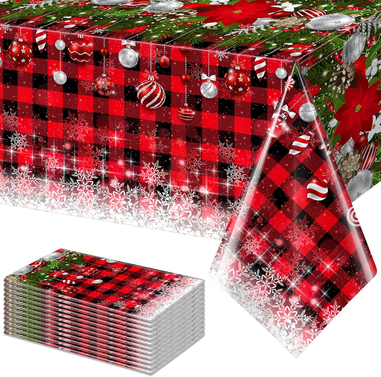 - What will you receive:12 pieces plastic Christmas party tablecloth,all over printed with white snowflake patterns and ornament on red and black buffalo plaid background,ideal for decorating your winter holiday Christmas party supplies and decorations