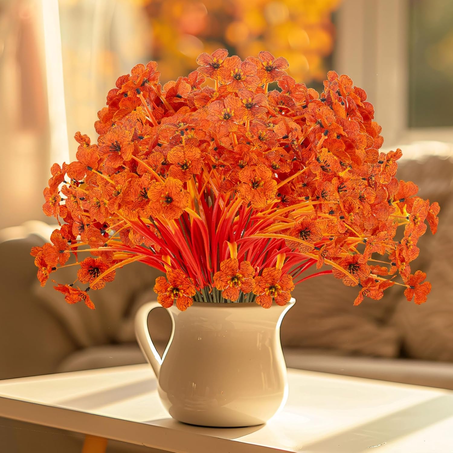 - 【Multifunctional decoration】 - Specially designed for autumn. These lifelike flowers add a charming to your front porch, walkway, garden,kitchen, windowsill,living room, dining table, bedroom, terrace and garden fence. Fake fall flowers are very suitable for daily home garden decoration, birthdays, holidays, weddings, memorial places, DIY projects, etc.