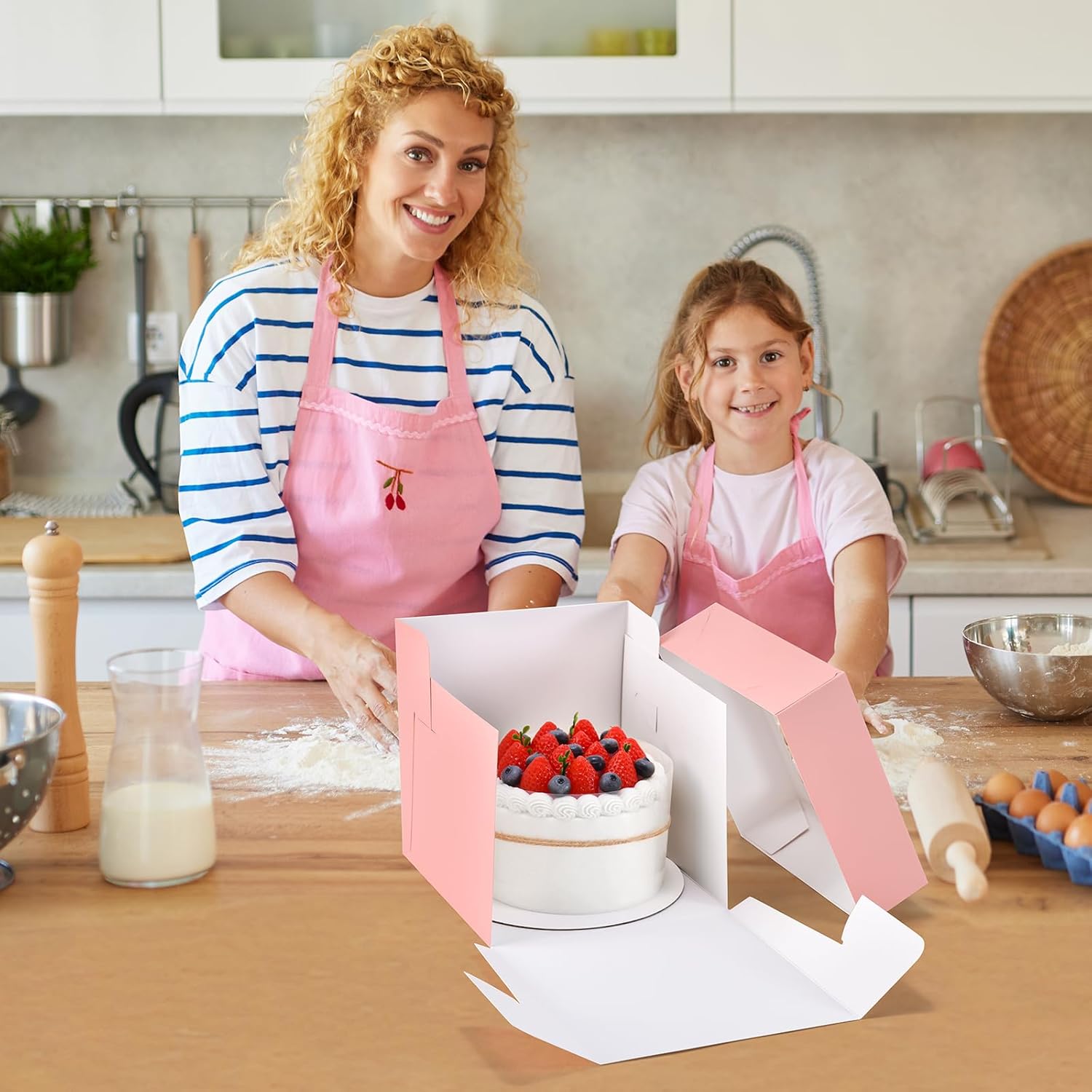 - Cake Boxes 8 Inch: Box Size: 8x8x8 inches, The pink mini cake boxes are perfect for cake drums within 8'', desserts, pastries, cookies, muffins, donuts, macaron, biscuits, cupcakes, chocolate covered strawberries, bread, other gifts and toys, The 8 inch cake boxes can be folded and stored when not in use, saving space
