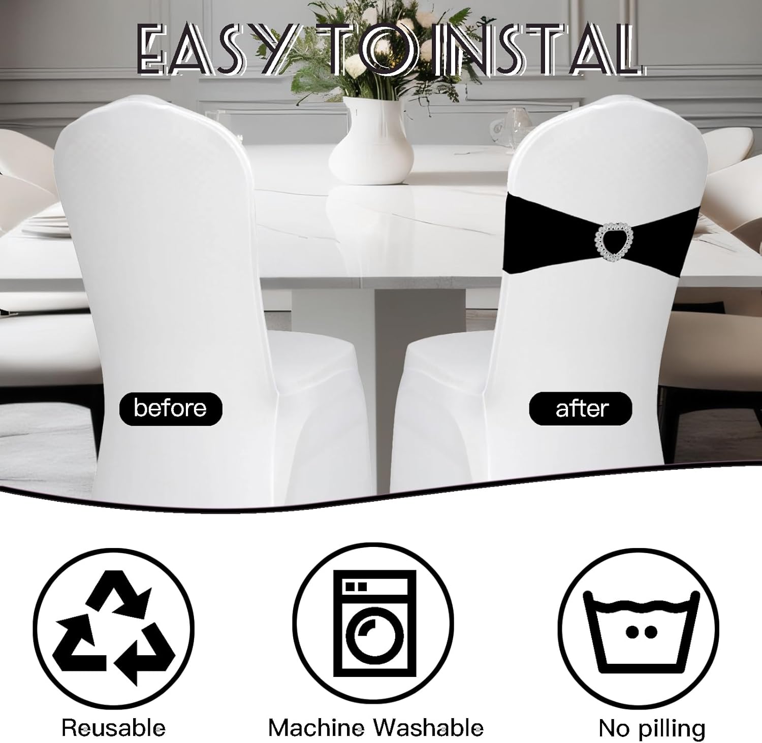100PCS Spandex Stretch Black Chair Sashes Bows Universal Elastic Chair Cover Bands Ties with Buckle Slider for Wedding Party Birthday Reception Event Banquet Decoration(Black)