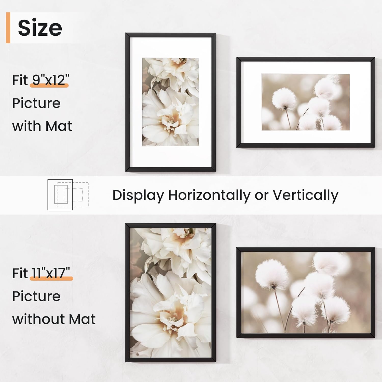 - Vertical & Horizontal Display - Our wall photo frames are versatile and easy to clip and hang. You can mount this plastic picture frame horizontally or vertically, with hanging hardware included. This picture frame maximizes your available space.