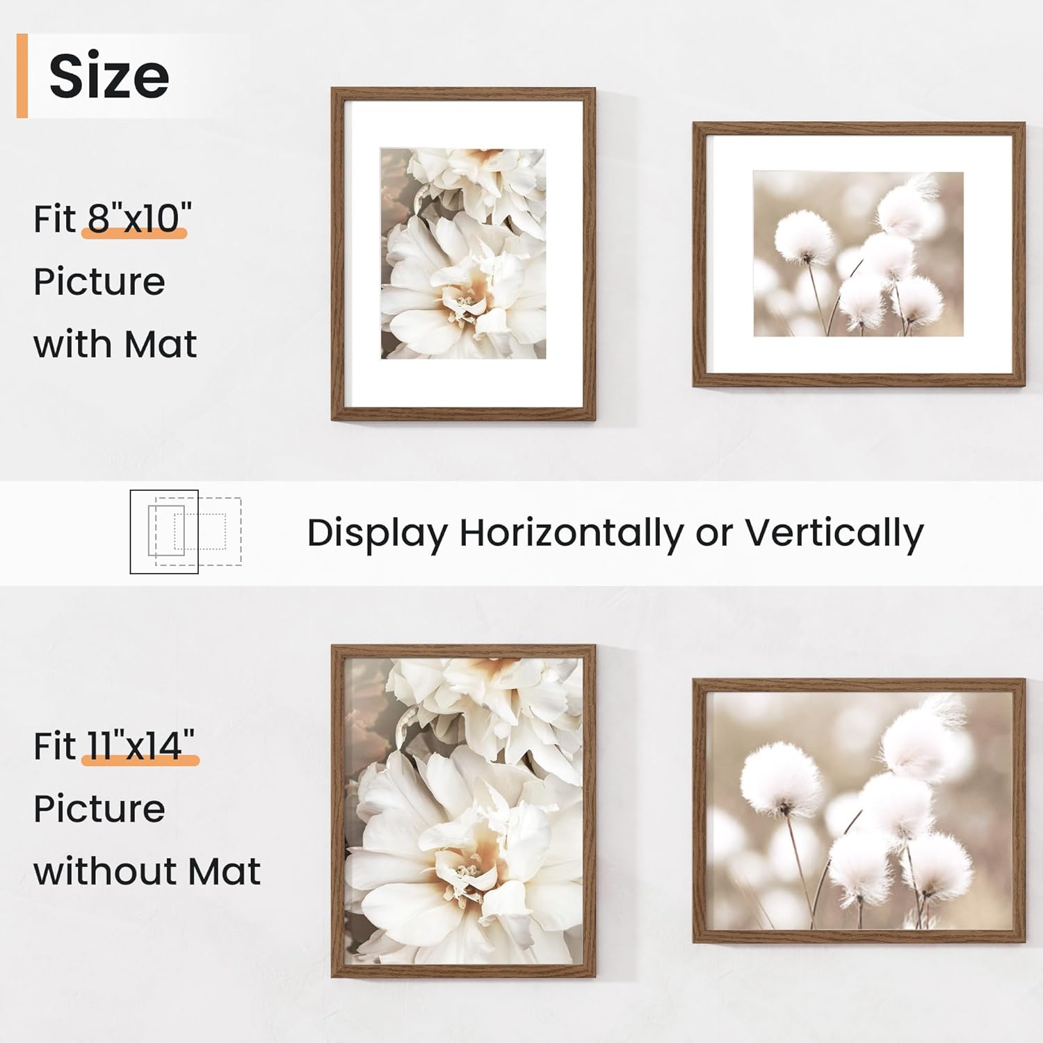 - Display Precious Memories - Showcase your cherished moments with our 11x14 plastic frame. It's lightweight yet sturdy with a superior quality finish. The white mat opening (measuring 7.5x9.5) is perfect for a 8x10 picture with the mat, or an 11x14 picture without it.