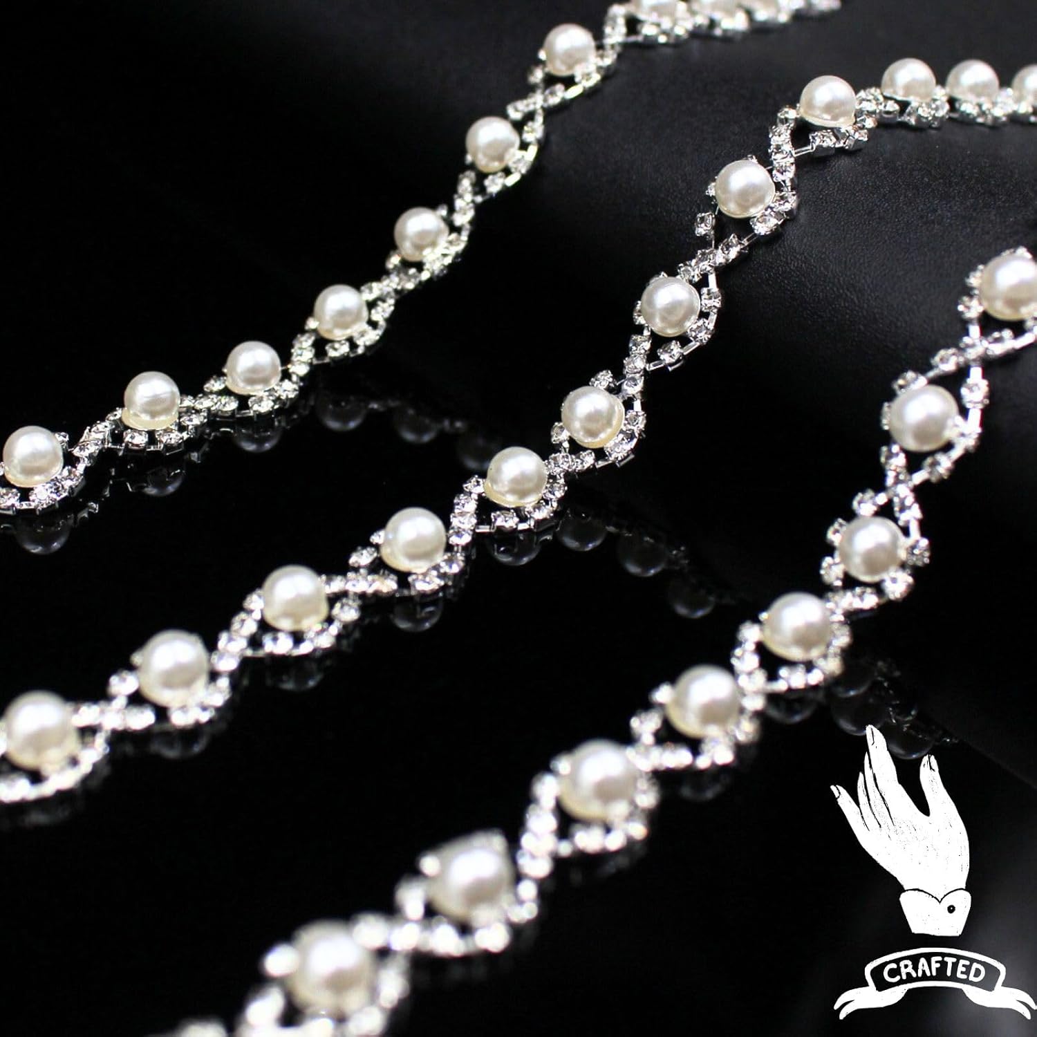 1 Yard Pearl Trim Chain Rhinestone Silver String Crystal Applique Fringe Ribbon Strips Beads Sewing Dress DIY Party Wedding Bouquet for Decoration Bridal Costume Embellishment