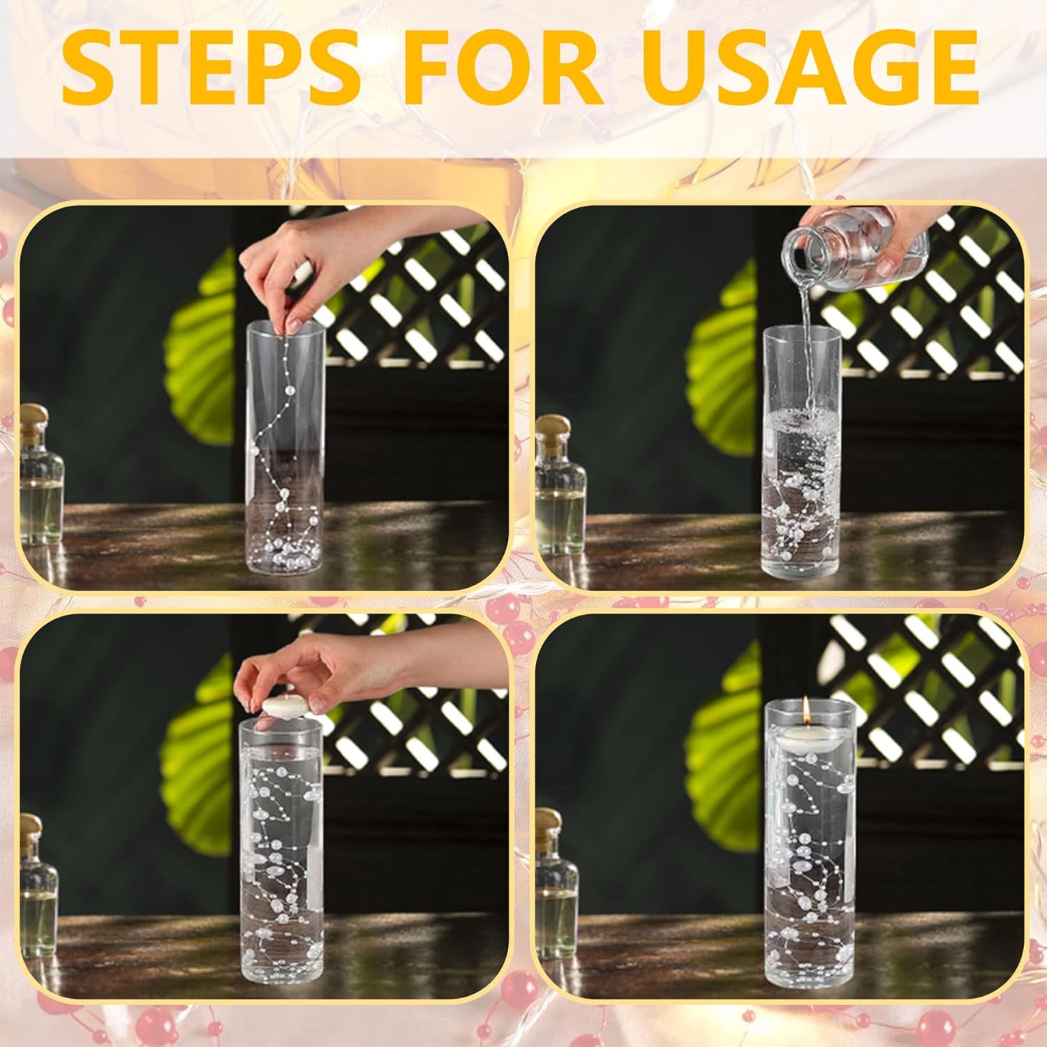 - Pearl String Beads: These artificial fake pearls strands are designed for floating candles, easy to use, just fill the string beads into the floating candle glass candle holders; you can also fill the vase with water and add 2 or 3 strands of beads string, which will make the centerpiece more romantic and gorgeous, for tall or large vases, just fill it with more strands of pearl decorations to bring a rich and luxurious look to your precious vase filler