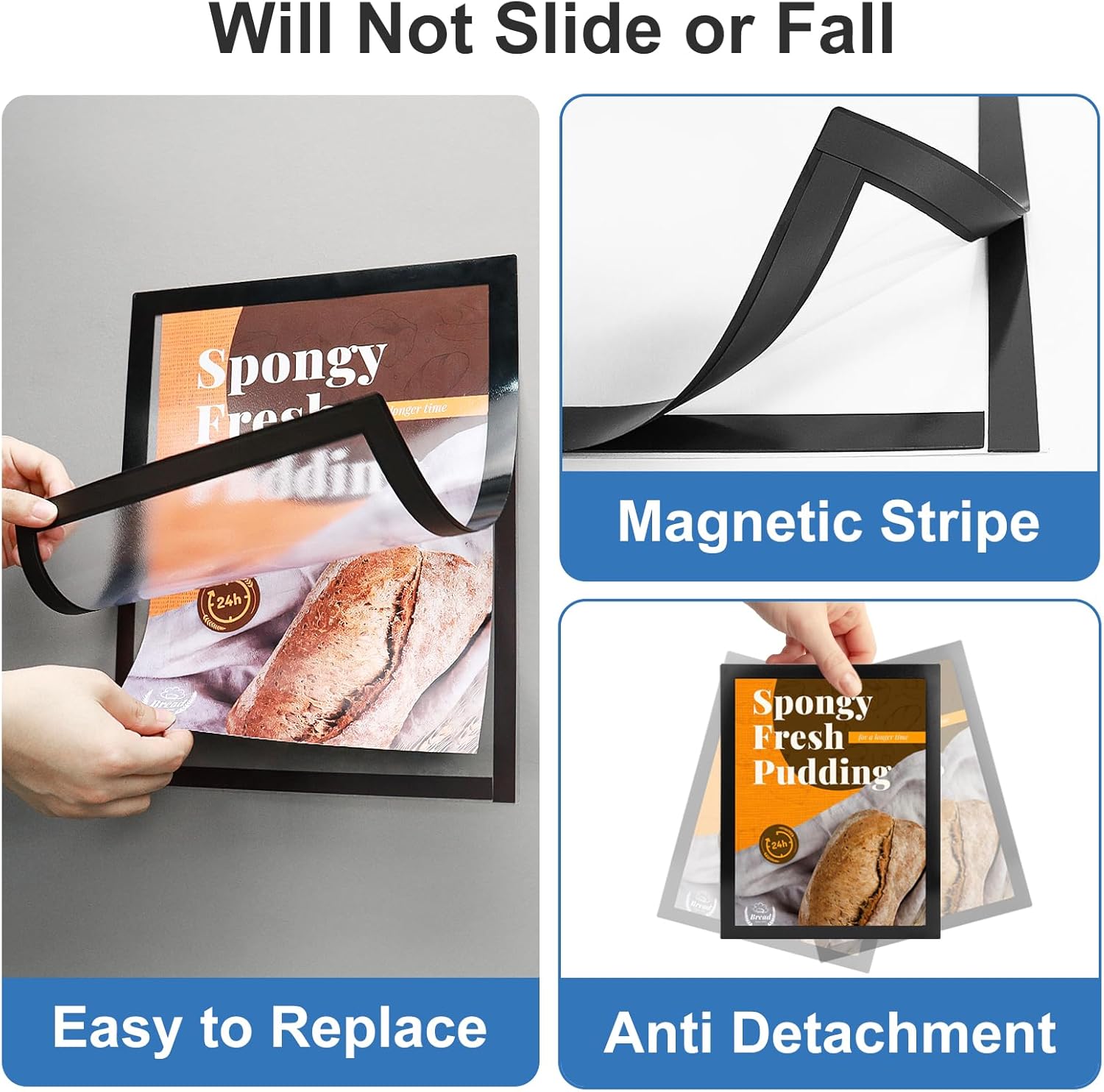- ✔【No Slipping or Falling Off】Strong magnetic strip frame holds posters in place and prevents them from slipping out. Comes with super-sticky backing to stick to any smooth solid surface, such as windows, refrigerators, glass, doors, wood panels, cubicles, and tiles.