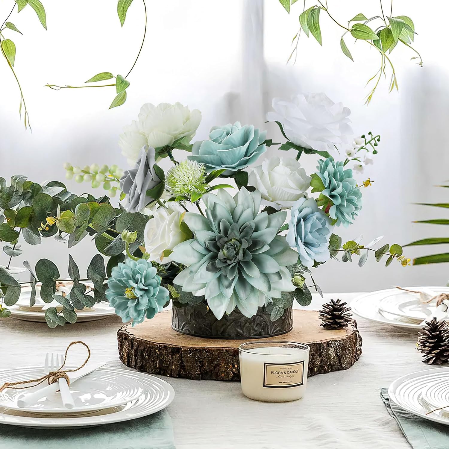 AmyHomie Teal Blue Artificial Flowers Combo Silk Mix Peony Rose Fake Flowers w/Stem for DIY Wedding Bouquets Centerpieces Arrangements Table Fall Decor Party Bridal Baby Shower Home Decorations