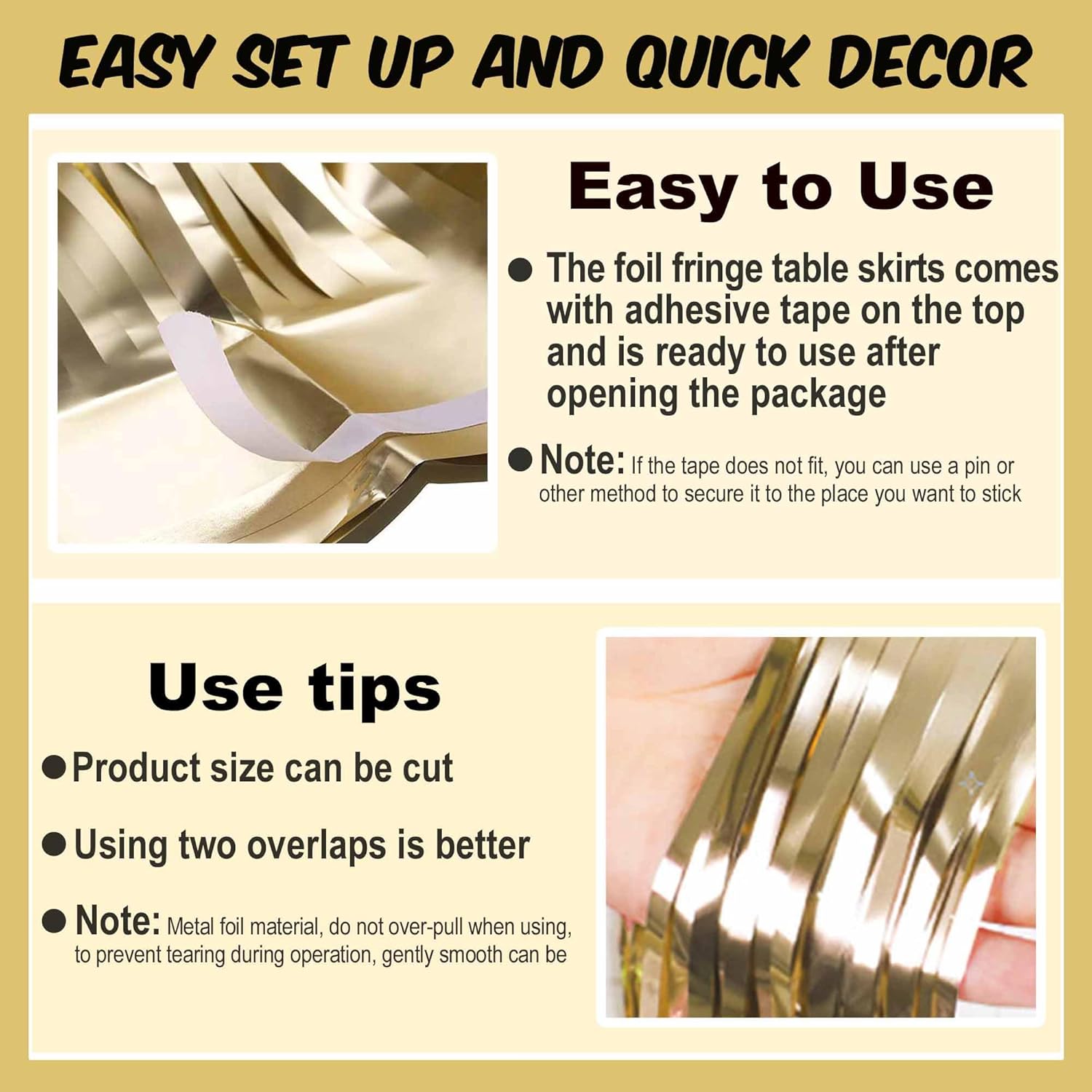 - Easy to Use: Each metallic fringe table skirts comes with self-adhesive tape on the top for easy attachment to your wall or table, just peel off the tape and then stick, easy and fast to install.