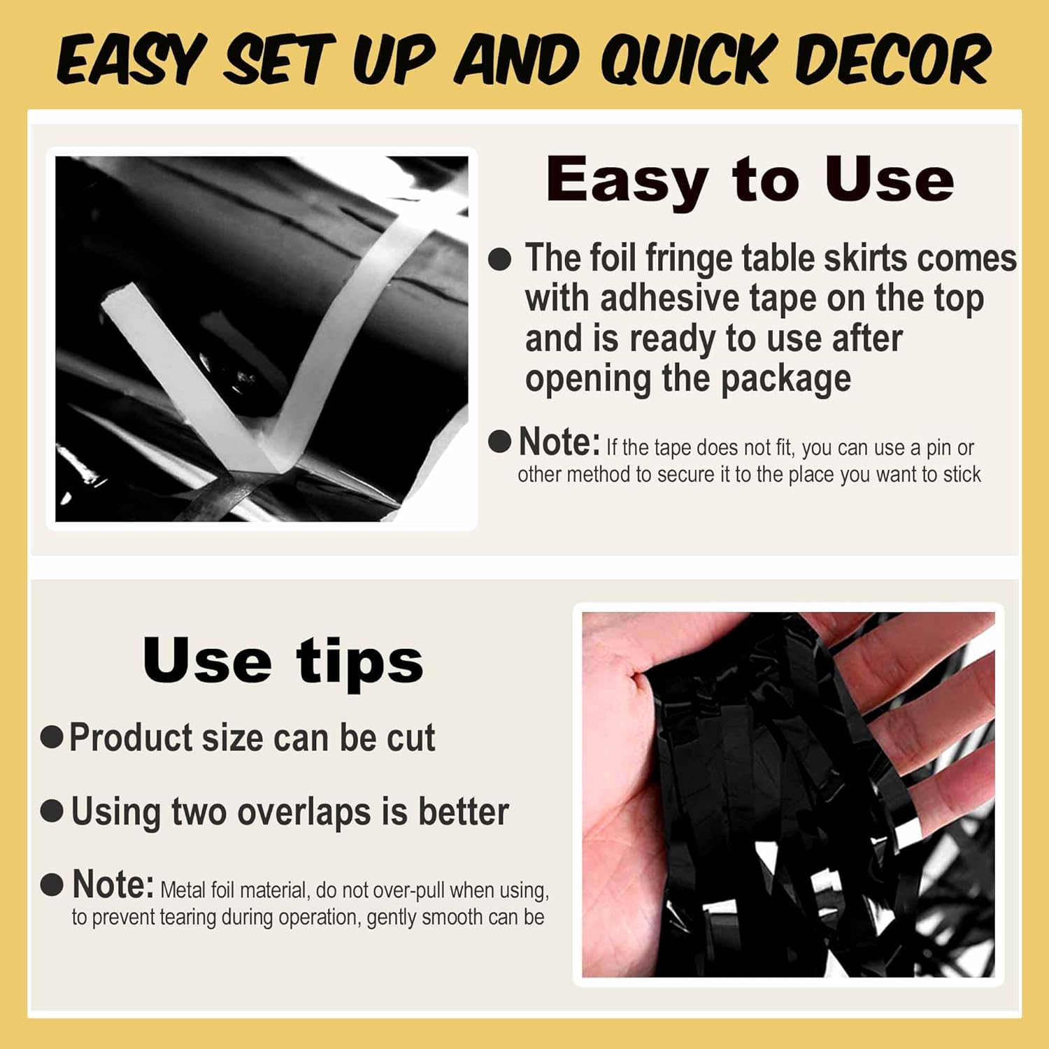 - Easy to Use: Each metallic fringe table skirts comes with self-adhesive tape on the top for easy attachment to your wall or table, just peel off the tape and then stick, easy and fast to install.