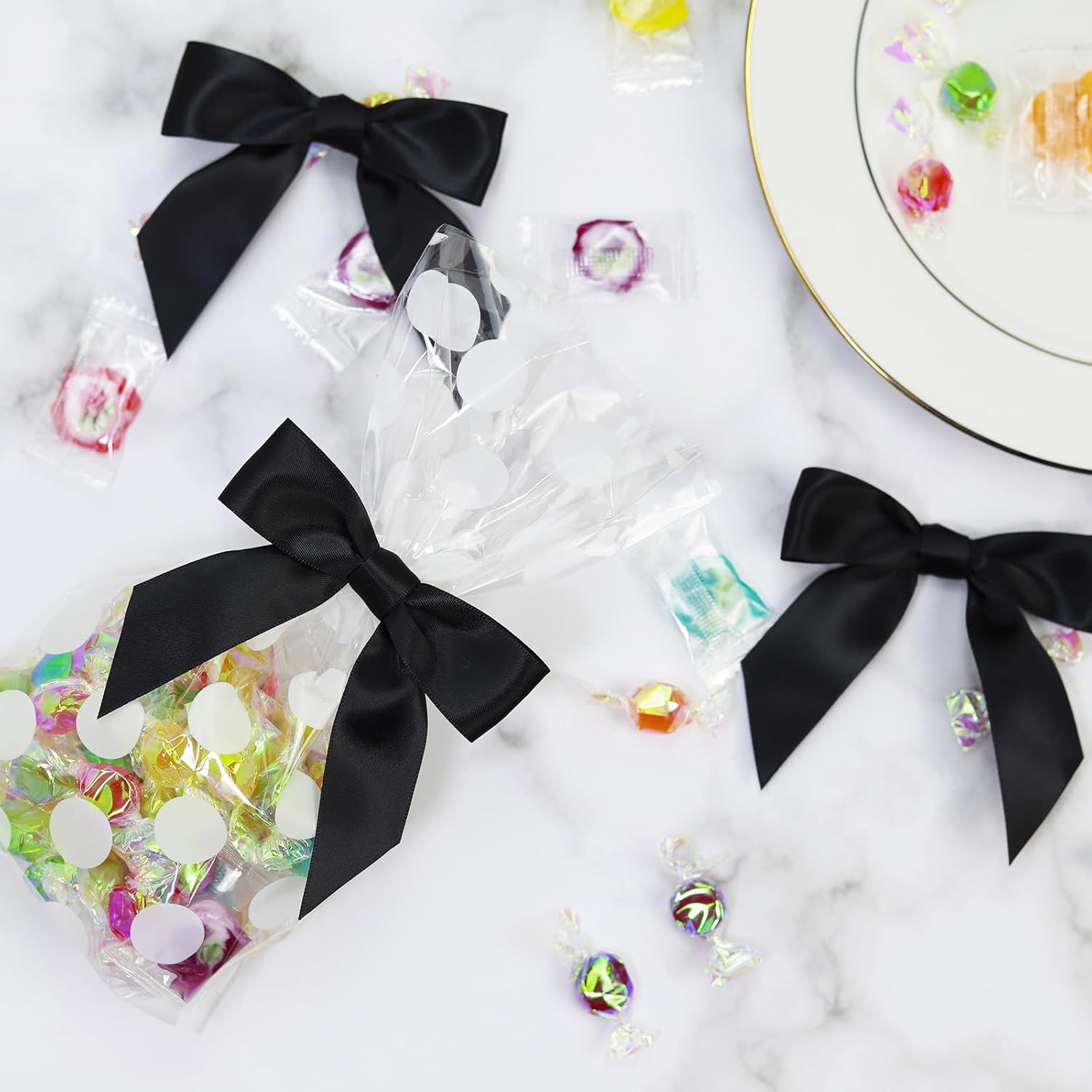 114 Pack Twist Tie Bows for Treat Bags 3" Black Satin Ribbon Bows for Package Craft, Gift Wrapping Decoration, Candy Bags, Bakery Bags, Wedding, Baptism, Tableware Decor Party Decoration