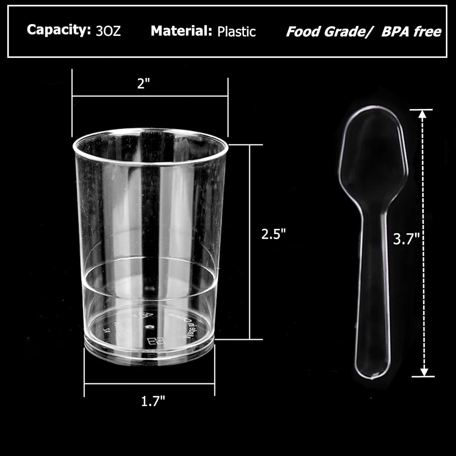 - Valuable Package: Includes 100pcs plastic dessert cups and 100pcs plastic spoons, each dessert cup measure 2"D x 2.5"H, approx 3 oz capacity, enough quantity to meet your daily usages and events