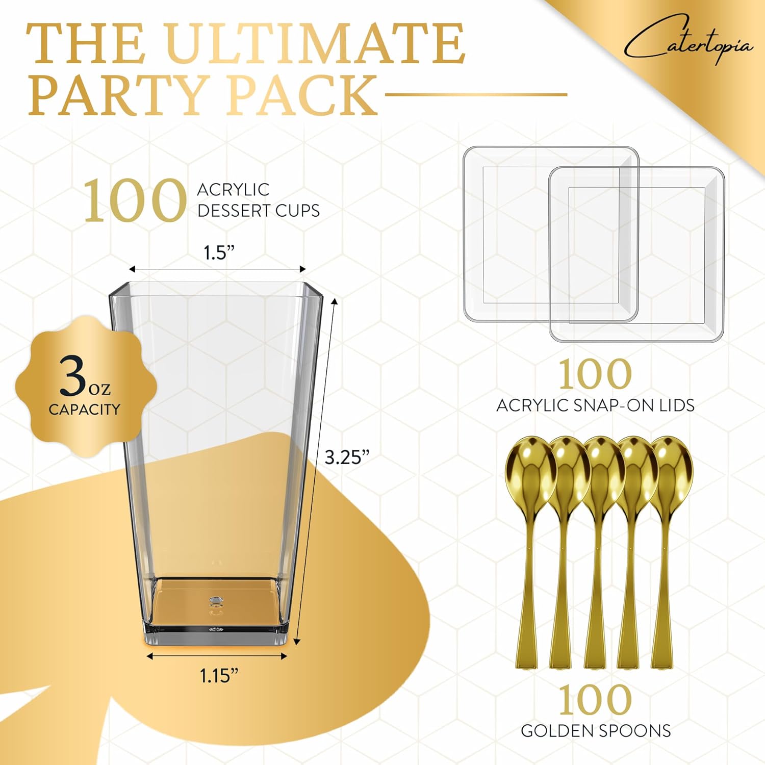 - THE ULTIMATE VALUE PACK that comes with 100 acrylic dessert cups, 100 acrylic lids and 100 golden spoons to serve each and every guest in style. Add to Cart now for a pack of luxury 3 ounce mini trifle cups that’ll blow your guests away!