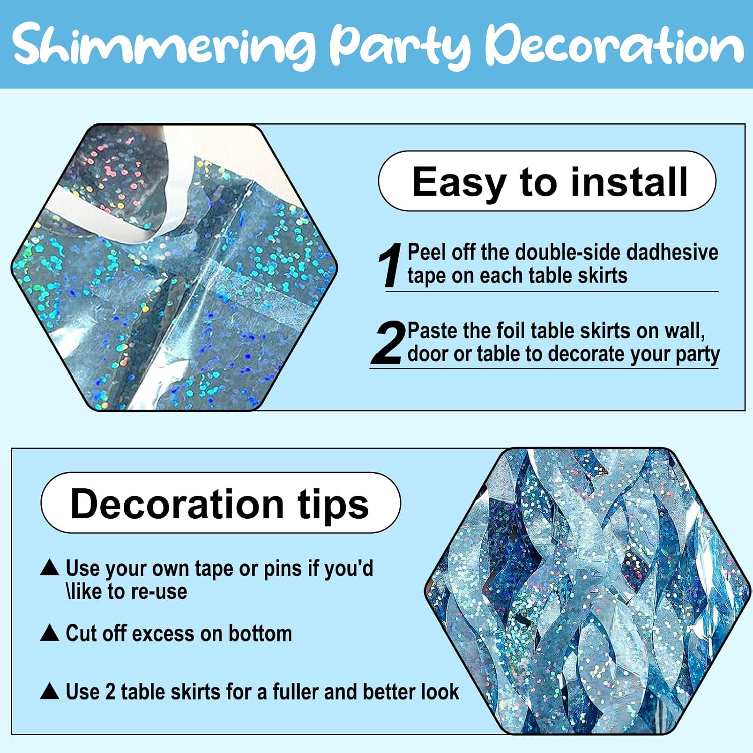 - Specifications and dimensions:6 Packs metallic foil tassel table skirt 29x108 inches, which is enough to decorate your party, provide you with excellent Convenient installation: the table skirt is equipped with self-adhesive tape. Just tear off the tape and paste it. The installation is convenient and quick. It can be pasted on the edge of your round table and square table. It can be easily cut into any siz.