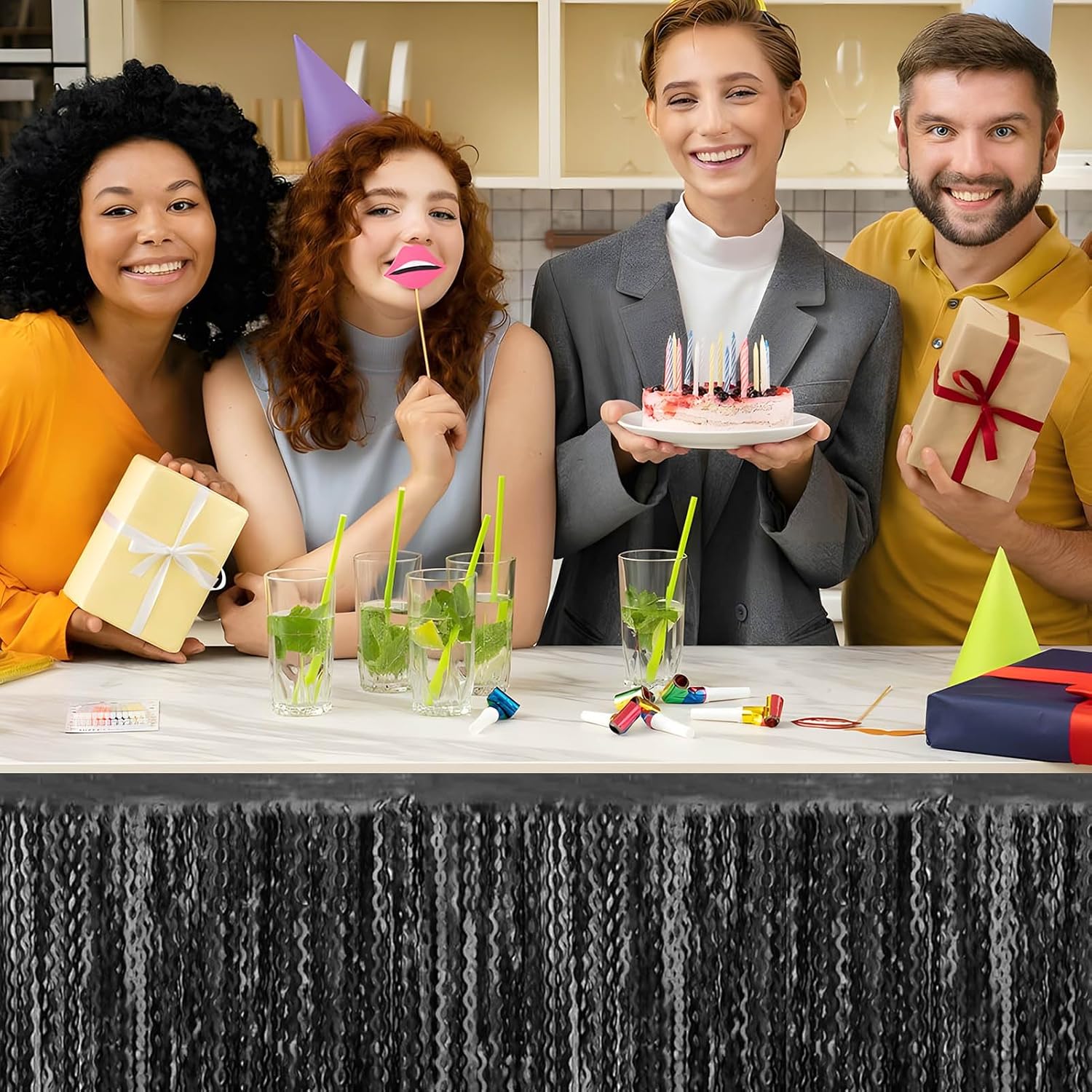 - Package Includes: 6pcs/set metallic fringe table skirts / shiny tassel banner, beautiful and shiny, provide you with great decoration effects, Each pack of table skirt measures 29x108 inches. Each one will be 9 Ft long, 6 pack will cover 54 FT length of tables.