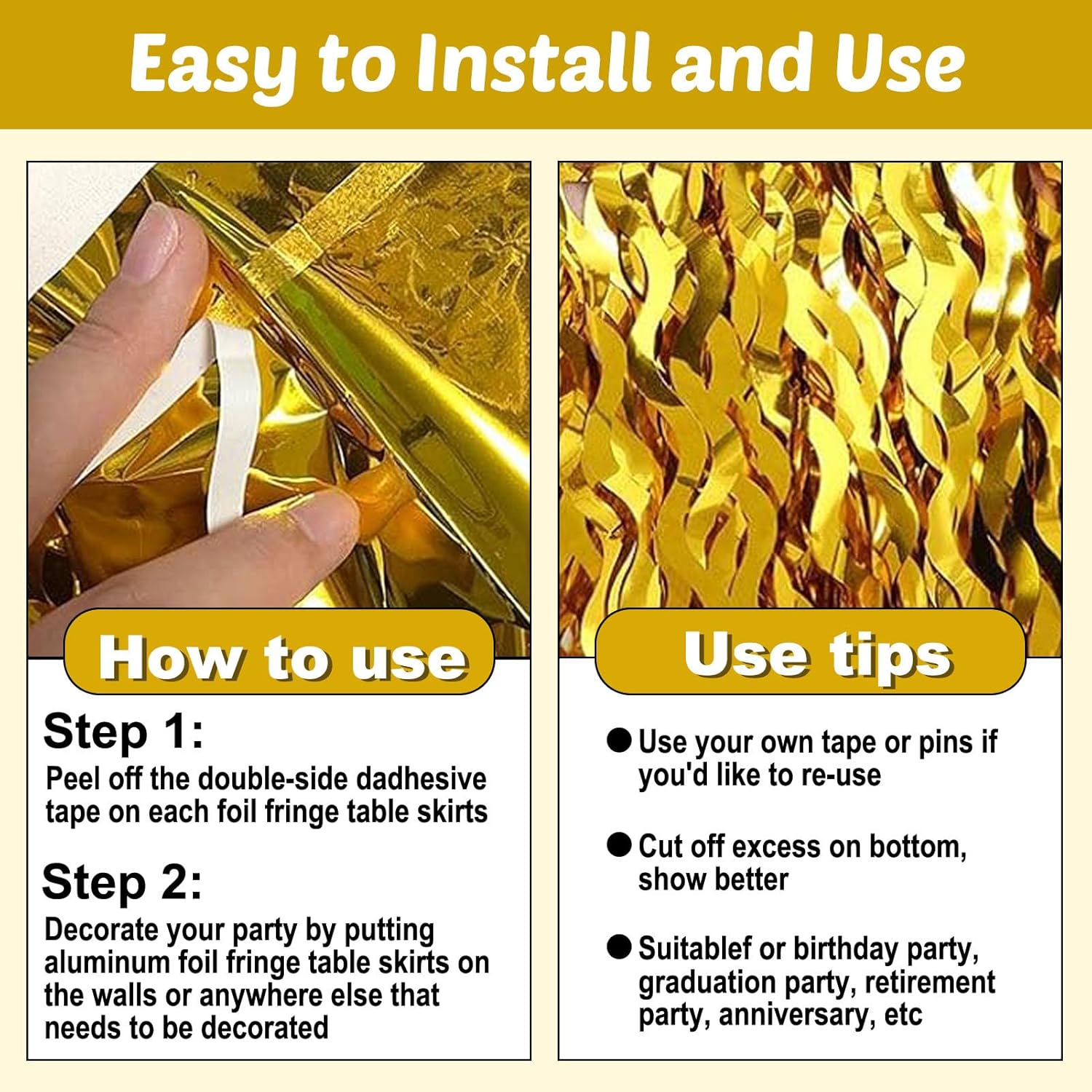 - Package Includes: 6pcs/set metallic fringe table skirts / shiny tassel banner, beautiful and shiny, provide you with great decoration effects, Each pack of table skirt measures 29x108 inches. Each one will be 9 Ft long, 6 pack will cover 54 FT length of tables.
