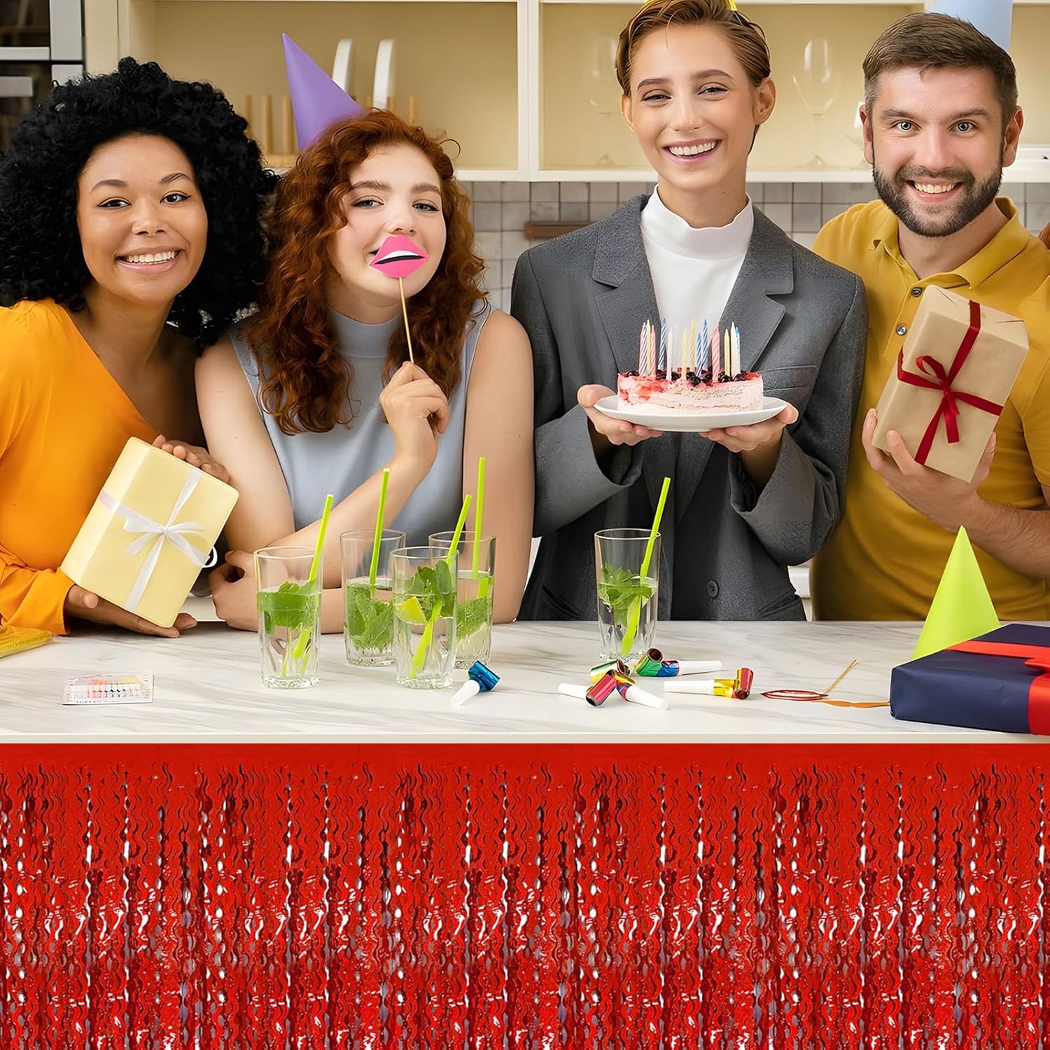 - Package Includes: 6pcs/set metallic fringe table skirts / shiny tassel banner, beautiful and shiny, provide you with great decoration effects, Each pack of table skirt measures 29x108 inches. Each one will be 9 Ft long, 6 pack will cover 54 FT length of tables.