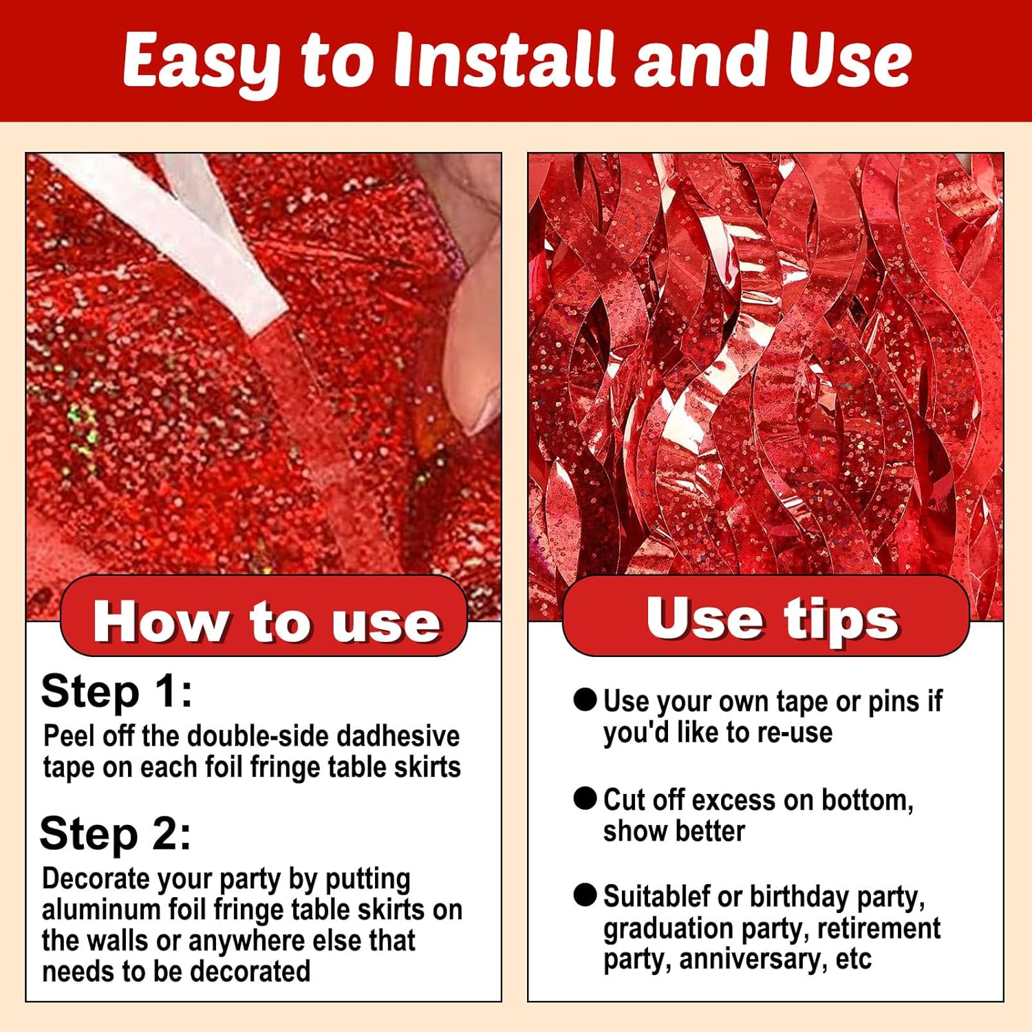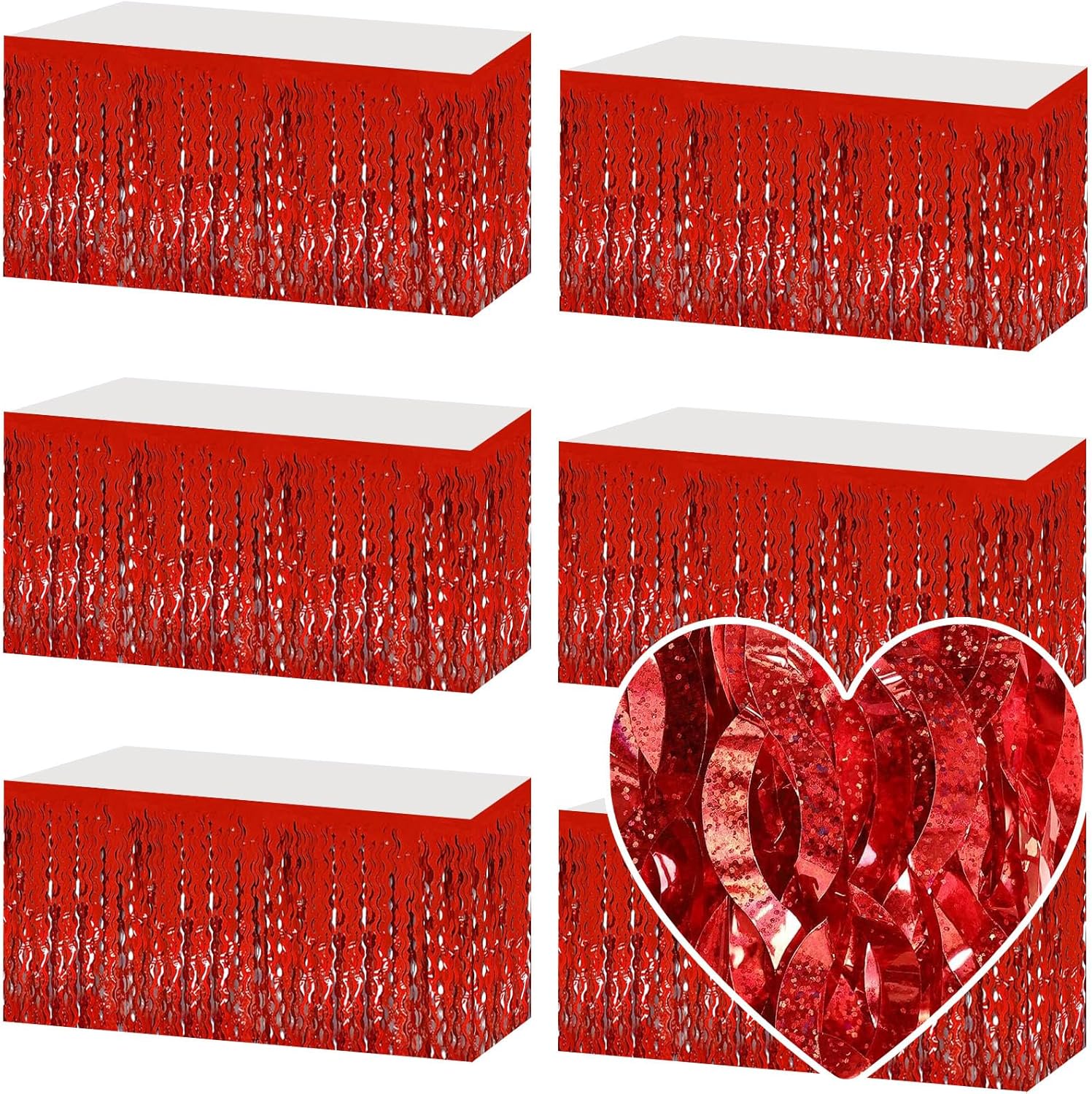 6 Pack 29x108 Inch Red Wave Foil Fringe Table Skirts Metallic Banner for Tinsel Streamer Garland Backdrop for Parade Floats Mother's, Graduate, Mardi Gras, Birthday, Wedding Party Decorations