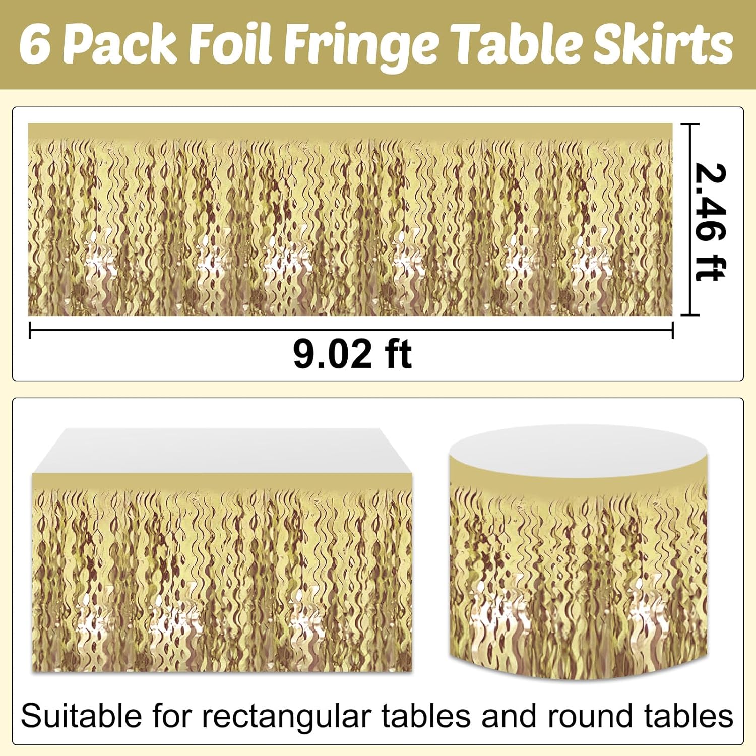 - Package Includes: 6pcs/set metallic fringe table skirts / shiny tassel banner, beautiful and shiny, provide you with great decoration effects, Each pack of table skirt measures 29x108 inches. Each one will be 9 Ft long, 6 pack will cover 54 FT length of tables.