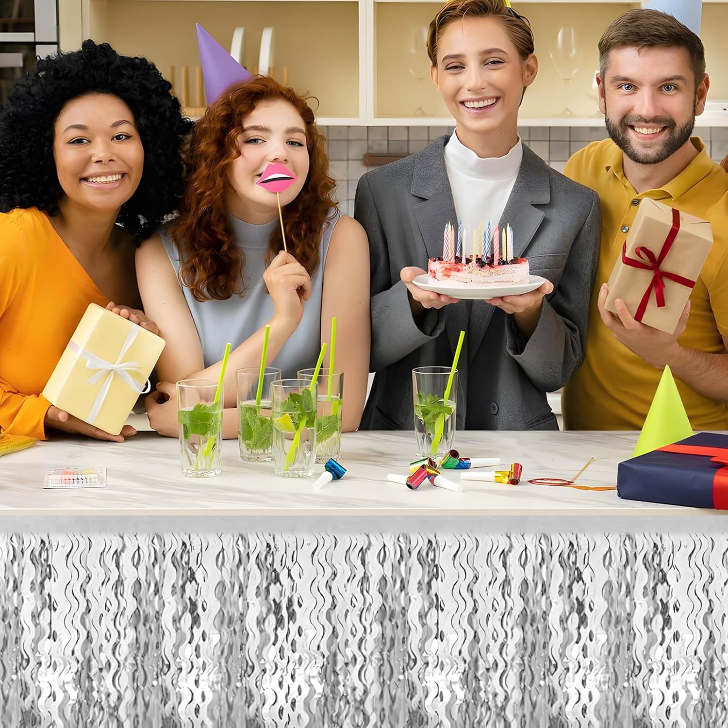 - Package Includes: 6pcs/set metallic fringe table skirts / shiny tassel banner, beautiful and shiny, provide you with great decoration effects, Each pack of table skirt measures 29x108 inches. Each one will be 9 Ft long, 6 pack will cover 54 FT length of tables.