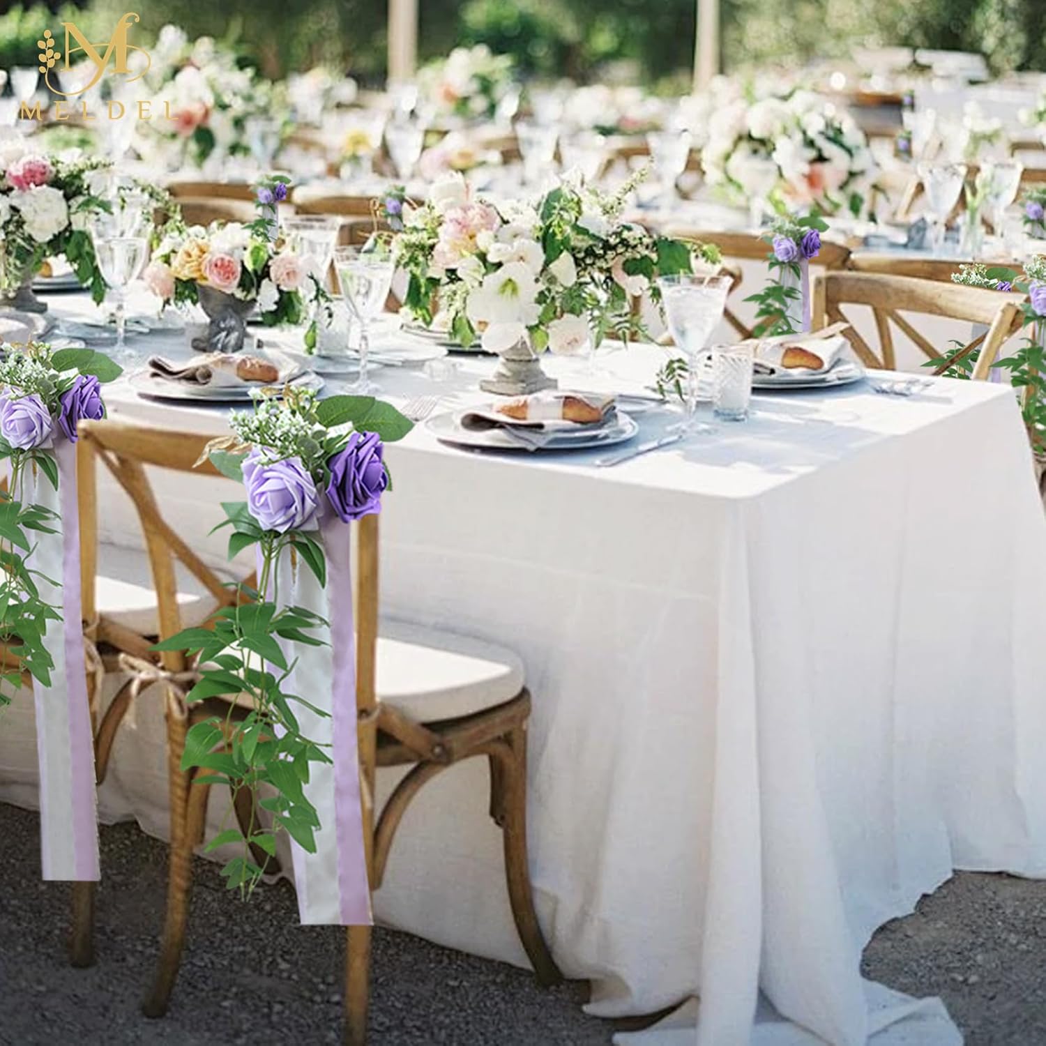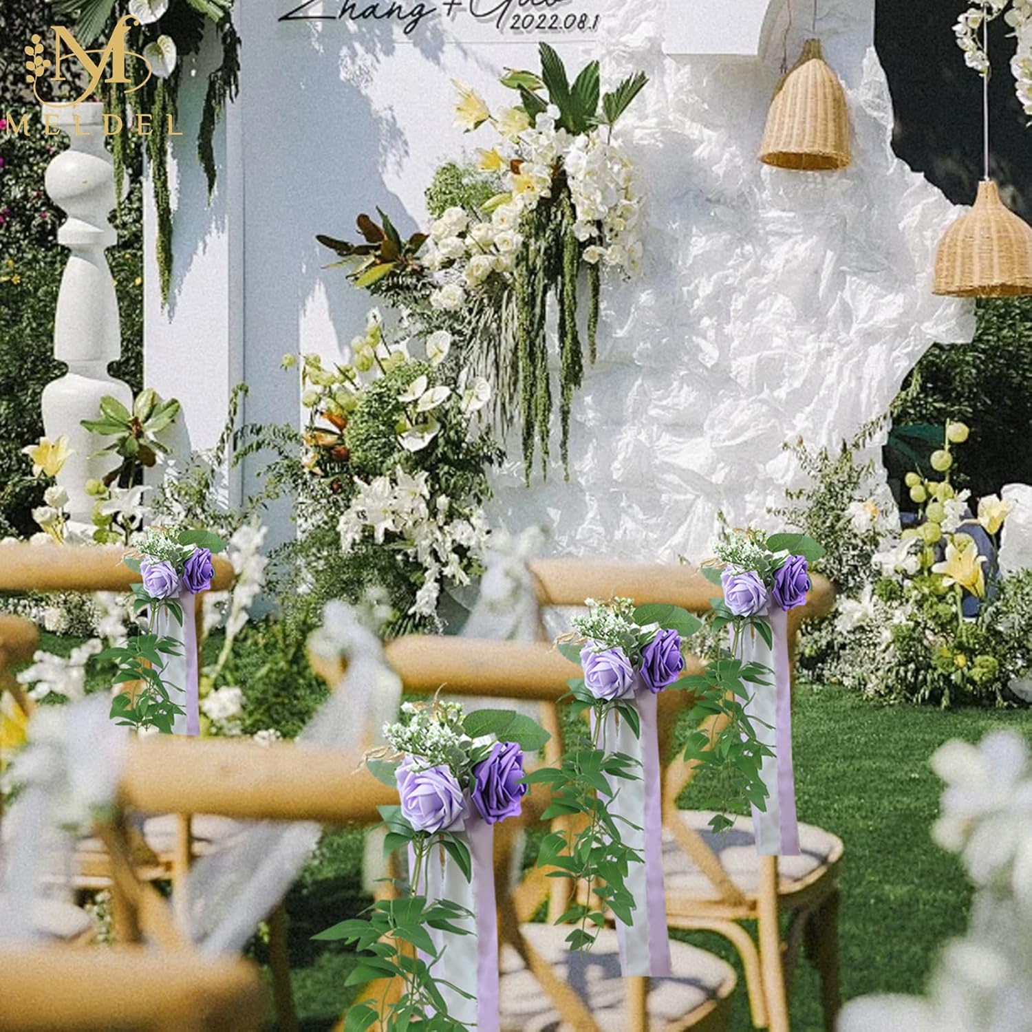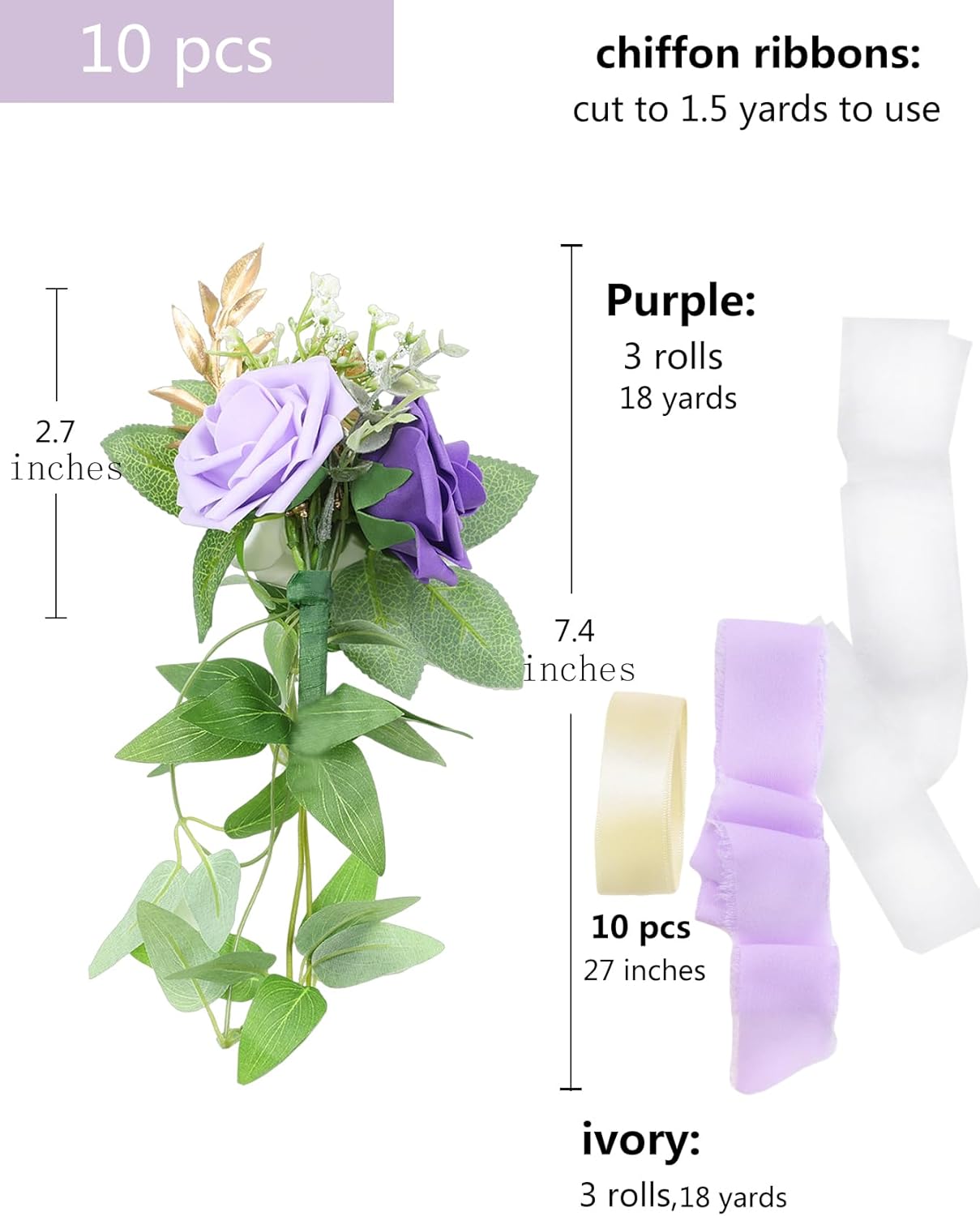 - High-Quality Material: Made of high-quality artificial wedding flowers, including 3 open big white purple foam rose, artificial greenery, gold leaves, rose and eucalyptus leaves clematis leaf rattan and accessories.Each set is matched with two colors of chiffon fabric ribbon, 3 rolls of each color, a total of 18 yards. Each color of ribbon can be cut into 10 lengths to match each flower according to the height of the chair.