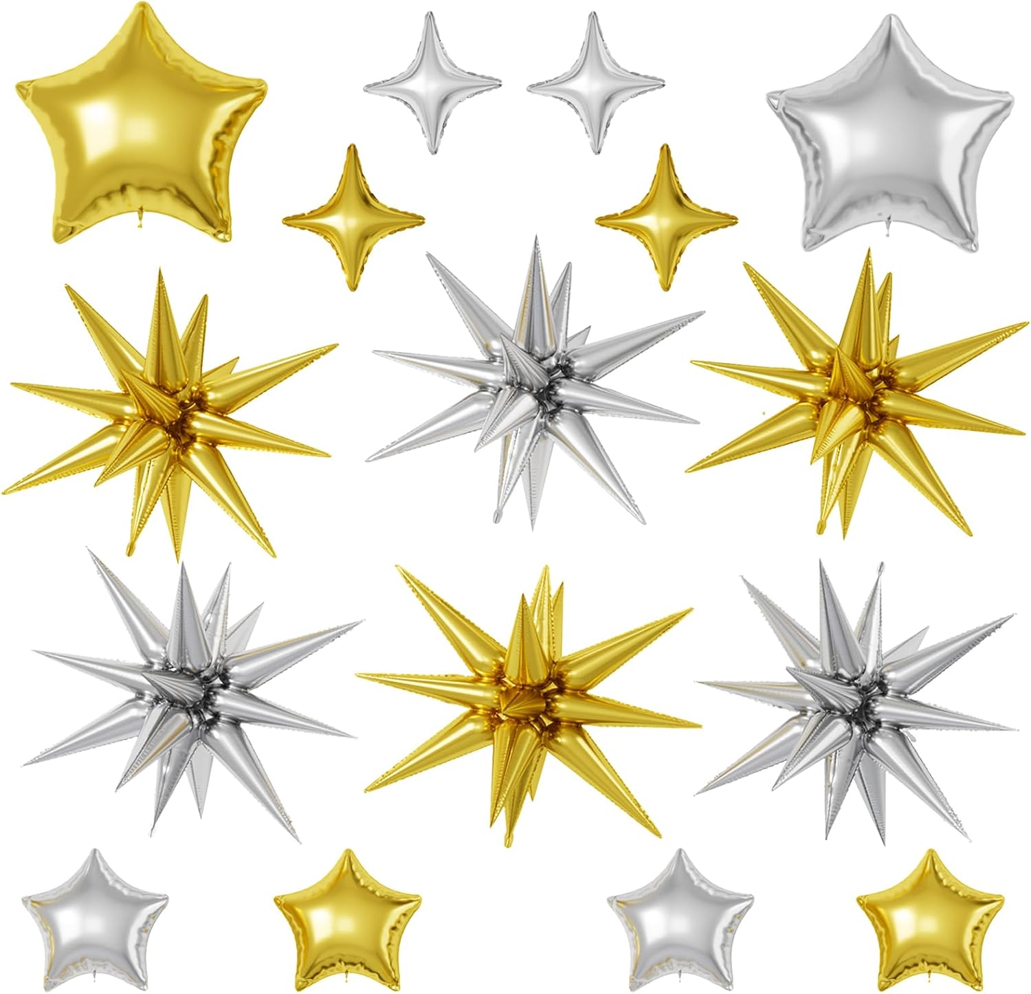 16 Pcs Gold Silver Star Balloons, 22/18/10 Inch Foil Balloons, Four-Pointed Balloon for Kids Men Birthday Graduation Wedding Bridal Baby Shower Party Decorations