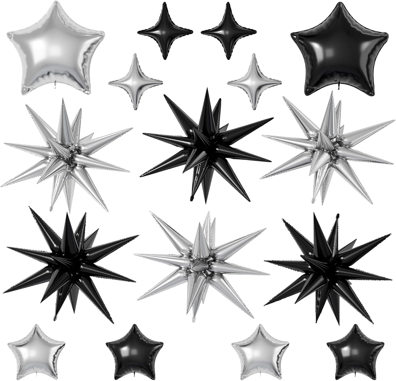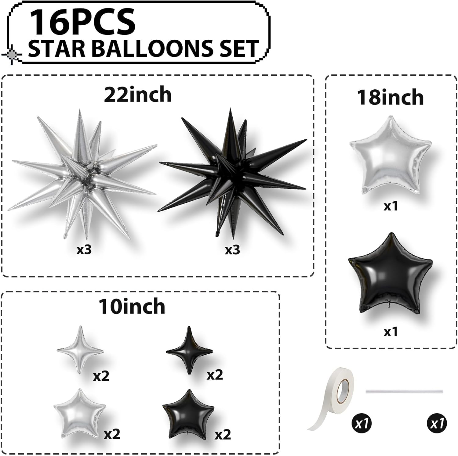 - 【Silver Black Star Balloons】The package includes:6pcs 22-inch Star-Shape balloons(Silver*3,Black*3), 4pcs 10-inch Four-Pointed Star balloons(Silver*2,Black*2), 2pcs 18-inch Five-Pointed Star balloons(Silver*1,Black*1), 4pcs 10-inch Five-Pointed Star Shape balloons(Silver*2,Black*2),1 dispense and 1 straw. These foil star balloons are Great for birthdays, weddings, baby showers, and engagement parties