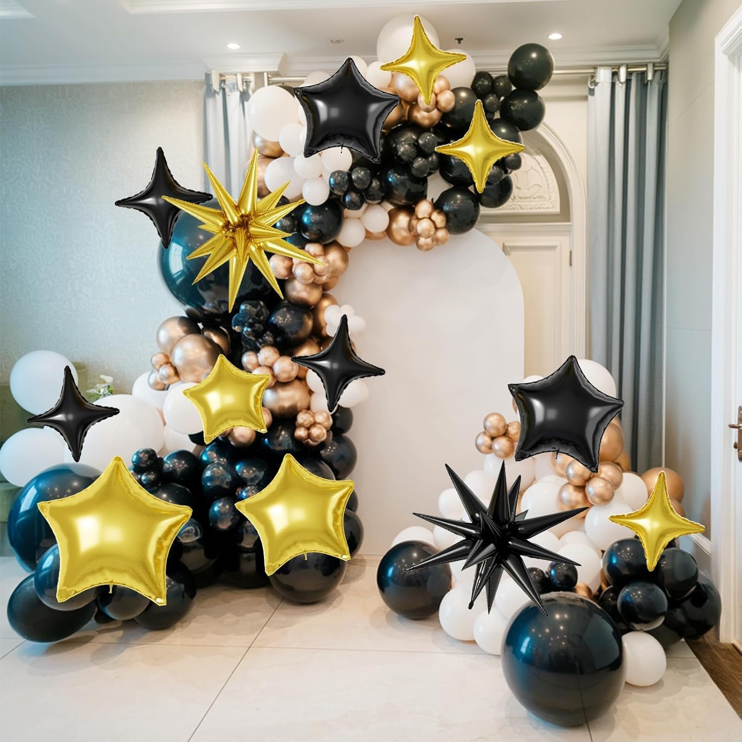 - 【Gold Black Star Balloons】The package includes:6pcs 22-inch Star-Shape balloons(Gold*3,Black*3), 4pcs 10-inch Four-Pointed Star balloons(Gold*2,Black*2), 2pcs 18-inch Five-Pointed Star balloons(Gold*1,Black*1), 4pcs 10-inch Five-Pointed Star Shape balloons(Gold*2,Black*2),1 dispense and 1 straw. These foil star balloons are Great for birthdays, weddings, baby showers, and engagement parties