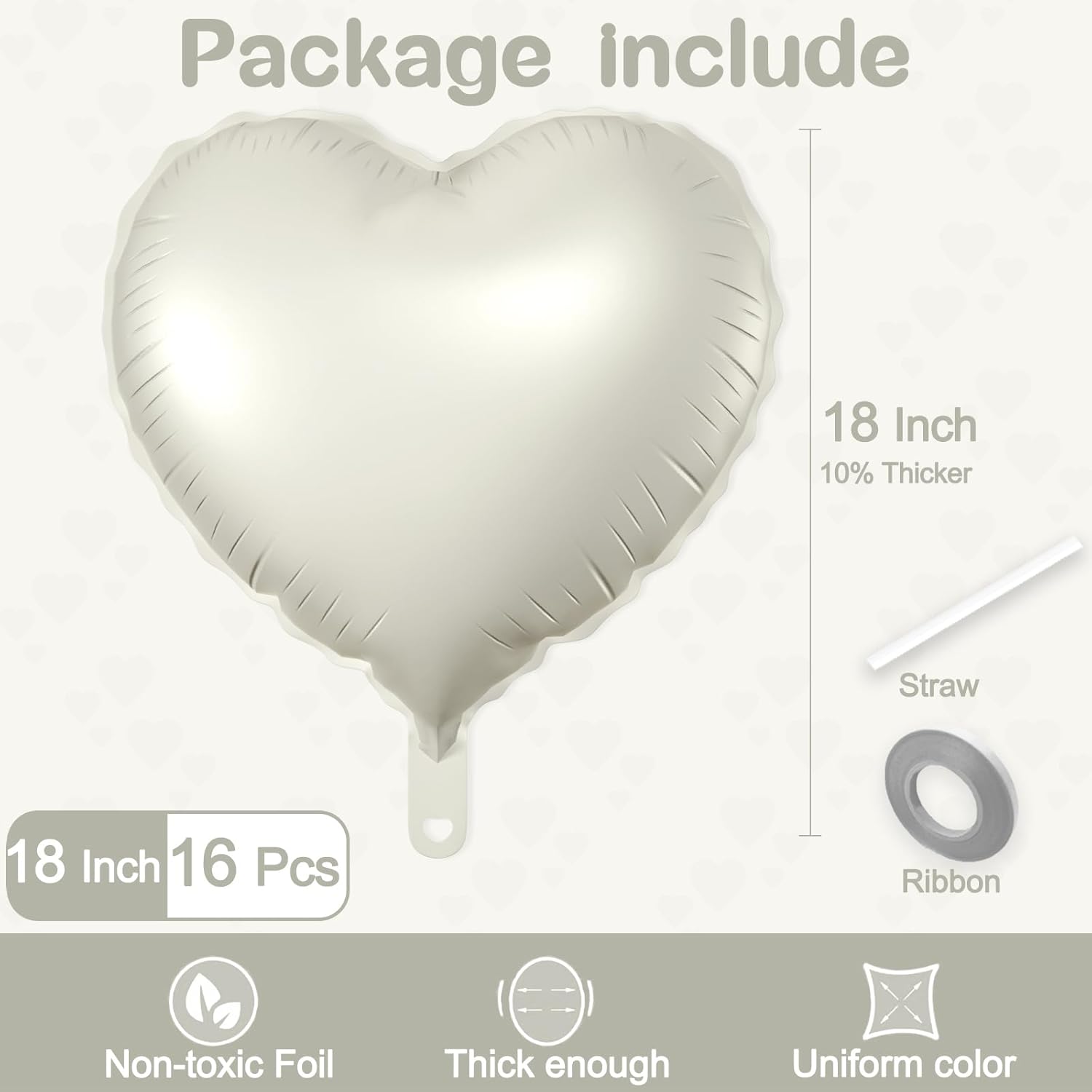 16 Pcs Heart Balloons, 18 White Sand Inch Love Heart Shaped Foil Balloons for Wedding Anniversary Birthday Party Valentine Decorations Baby Shower Bridal Shower Engagement Decorations Supplies