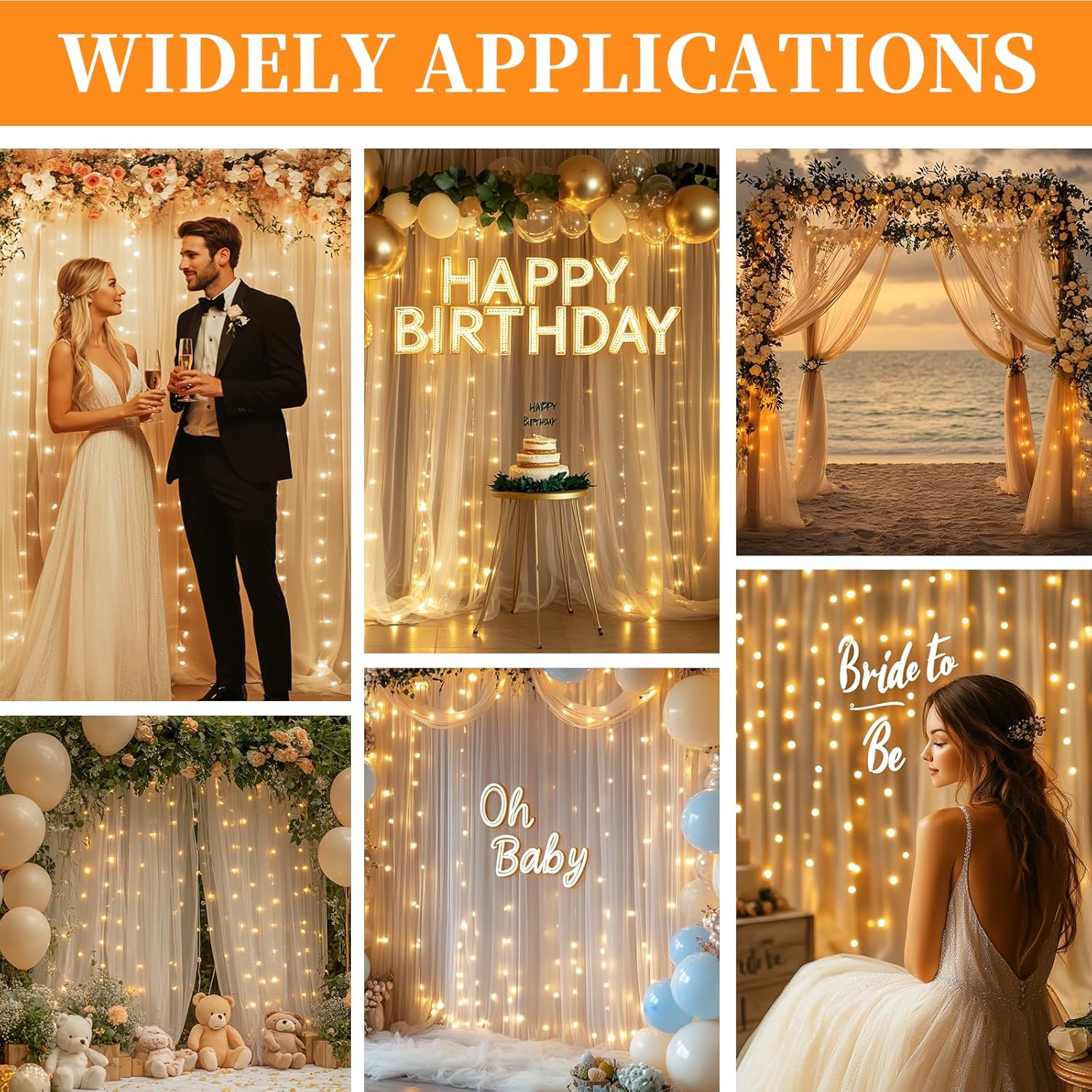 - Easy Setup & Reusable Decor: Designed for convenience, the tulle curtain features a 2.5-inch rod pocket for easy hanging on pipes or stands. Includes 12 Transparent clips make the lights simple to hang and secure to the backdrop, adding a warm, inviting glow. Reusable and easy to store, this set is perfect for multiple events