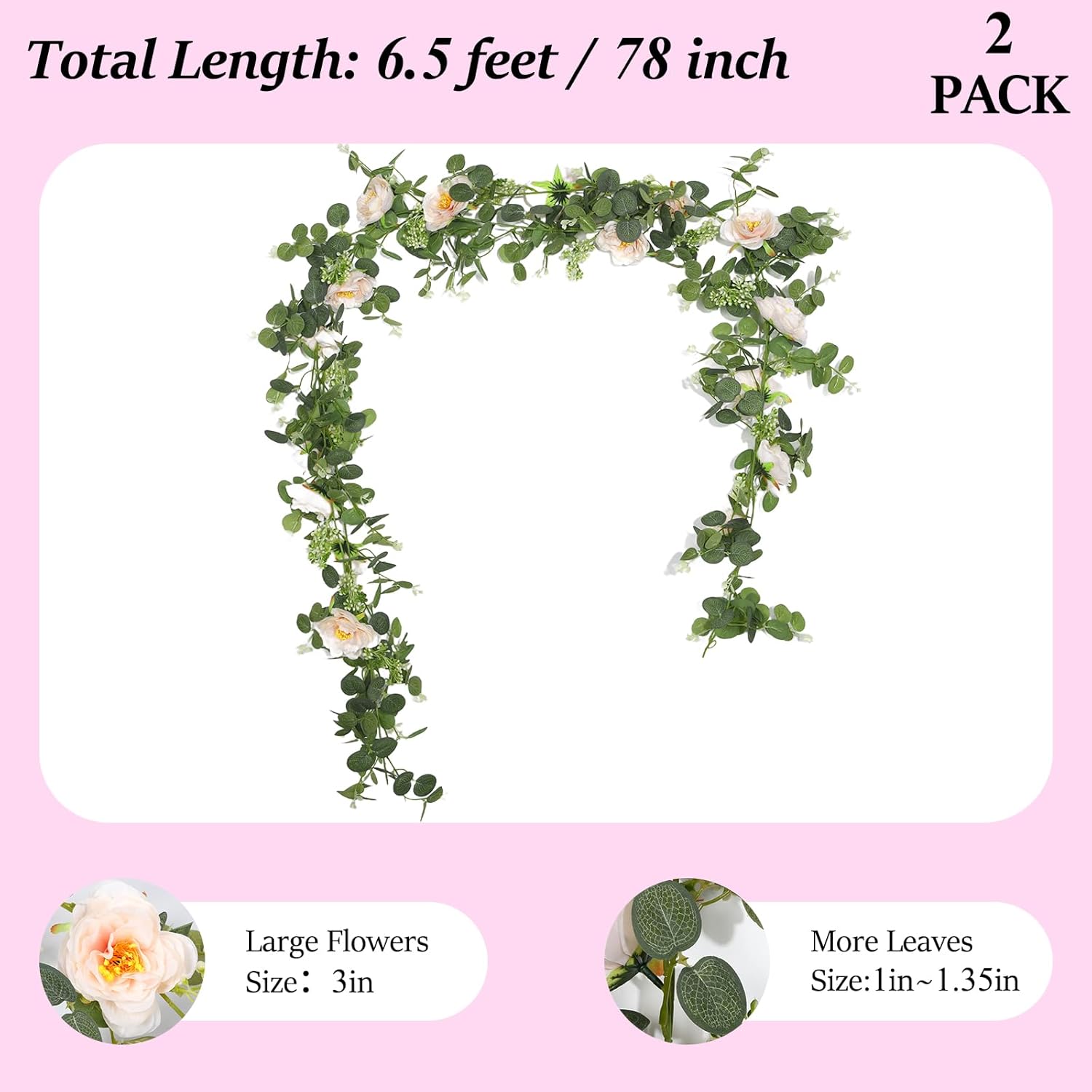 2Pcs Total 13 feet Eucalyptus Flower Garland with Fake Rose Flower, Artificial Fake Flowers Greenery Garland Floral Vines for Decoration Party Wedding Table Indoor Outdoor Backdrop Wall Decor(Pink)
