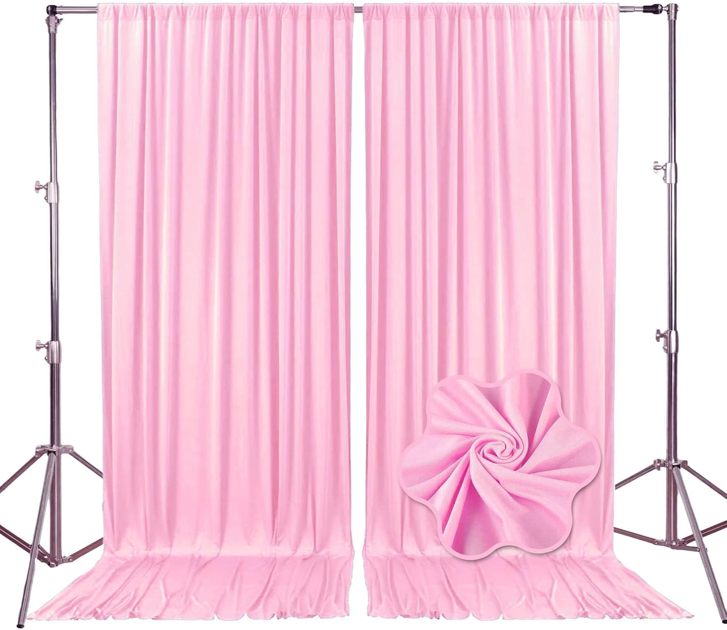 - 【Package Include】Each pack contains 2 panels of fabric shiny satin backdrop curtains. Each backdrop measures 10 feet x 10 feet (60 inches x 120 inches). There is a rod pocket designed on the top of the curtain, allowing you to easily hang it on a pipe or background stand. Tips: ONLY the backdrop curtains, no include a stand.