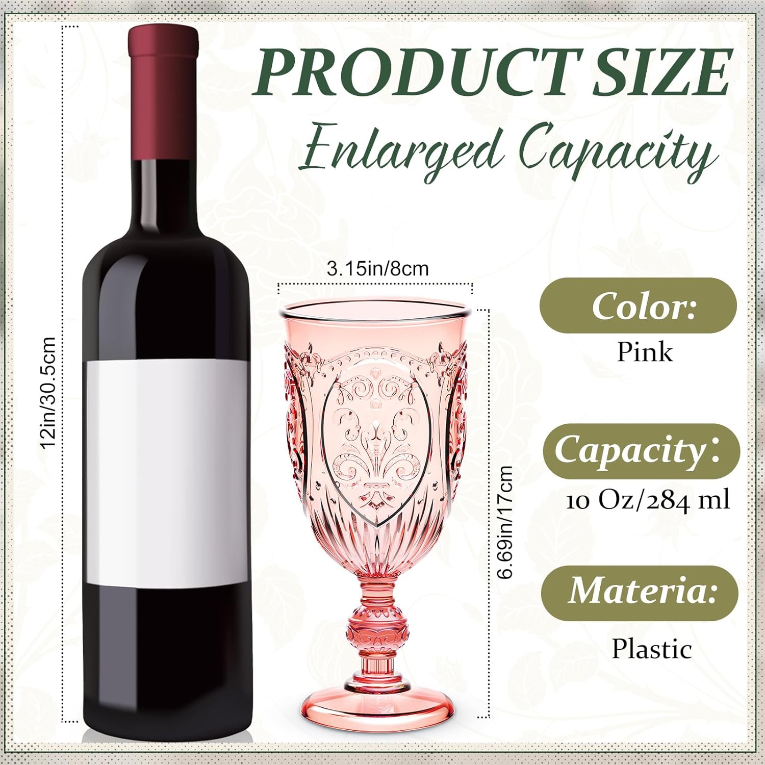 - Plastic Pink Goblet Set: you will receive a set of 18 plastic pink goblets, each with a capacity of 10 ounces; The bright and charming pink color adds a unique touch to various occasions; Whether as party decorations or the perfect gift for weddings or other special events, this goblet set will add a touch of elegance and joy to your celebrations