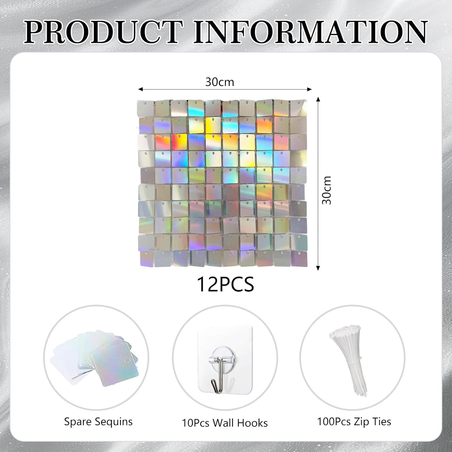 - 【Package Includes】Each box includes 12 colorful sequin wall panels (12"x 12" each). We provide enough zip ties (100 pcs), a pack of spare sequins, and wall hooks (10 pcs) to support the weight of the wind panel, as well as an installation manual. 12pcs can cover 3x4ft place. More boxs will cover a larger area and have a fuller look.