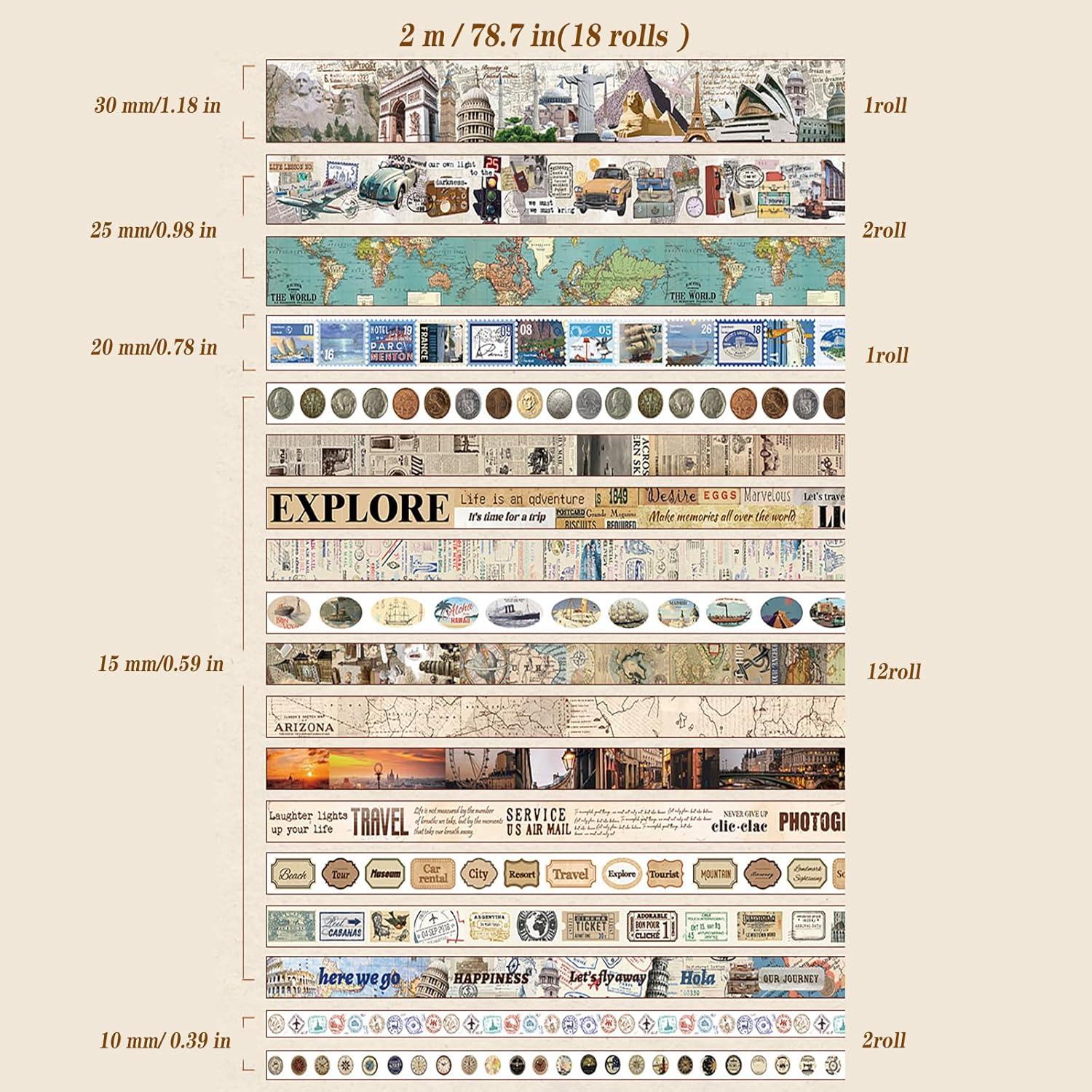 - Travel washi tape comes in a box with 18 rolls of high-quality washi tape in five sizes, including wide and thin washi tape. Each roll is 1.18 inches (30 mm) x 1 tape; 0.98 inches (25 mm) x 2 tapes; 0.78 inches (20 mm) x 1 tape; 0.59 inches (15 mm) x 12 tapes; 0.39 inches (10 mm) x 2 tape.